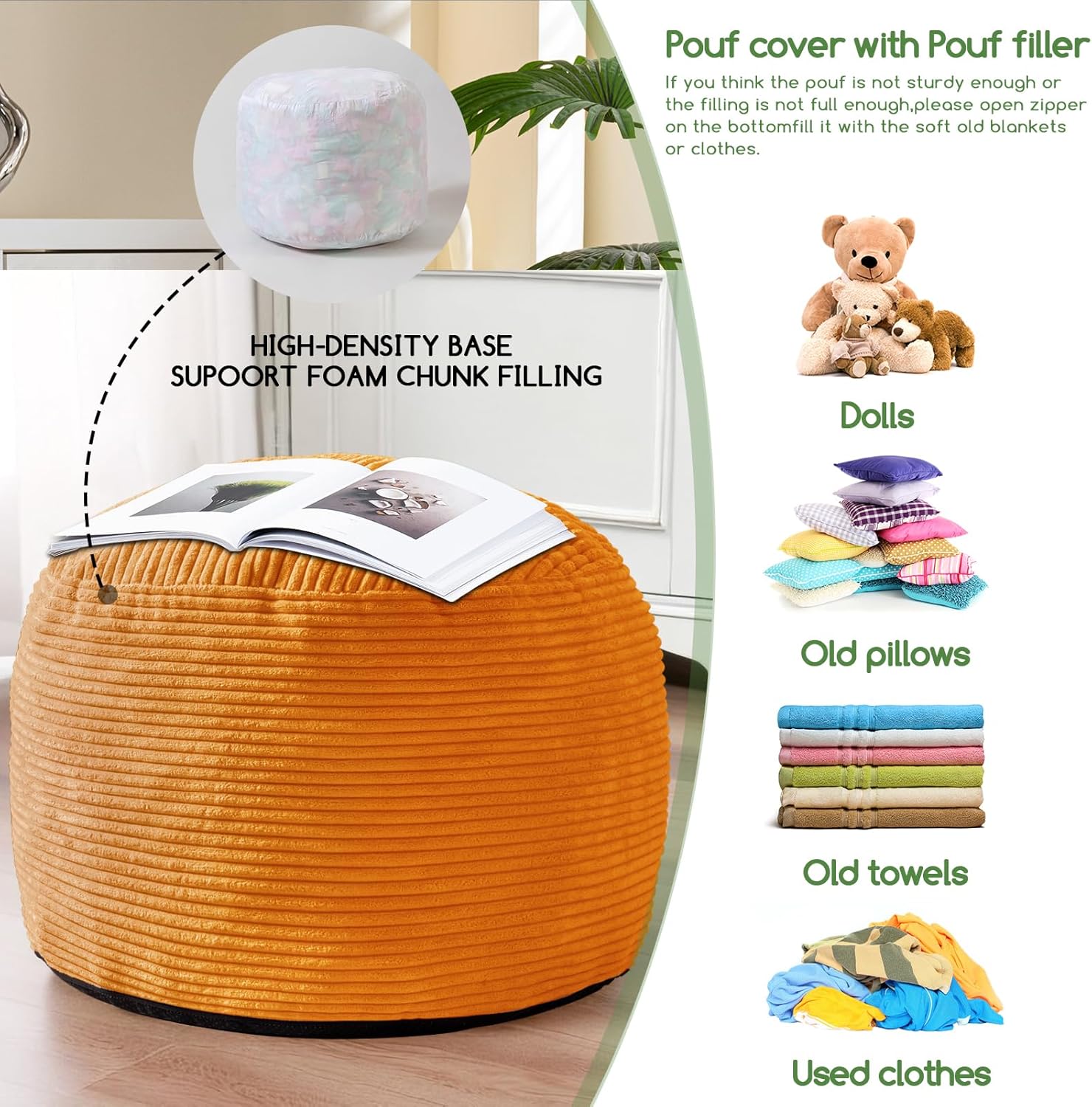 - For convenience and ease of use, this pouf ottoman comes pre-filled with memory foam chunk pouf filler, which can be easily inserted through the large round opening on the bottom with double zippers.