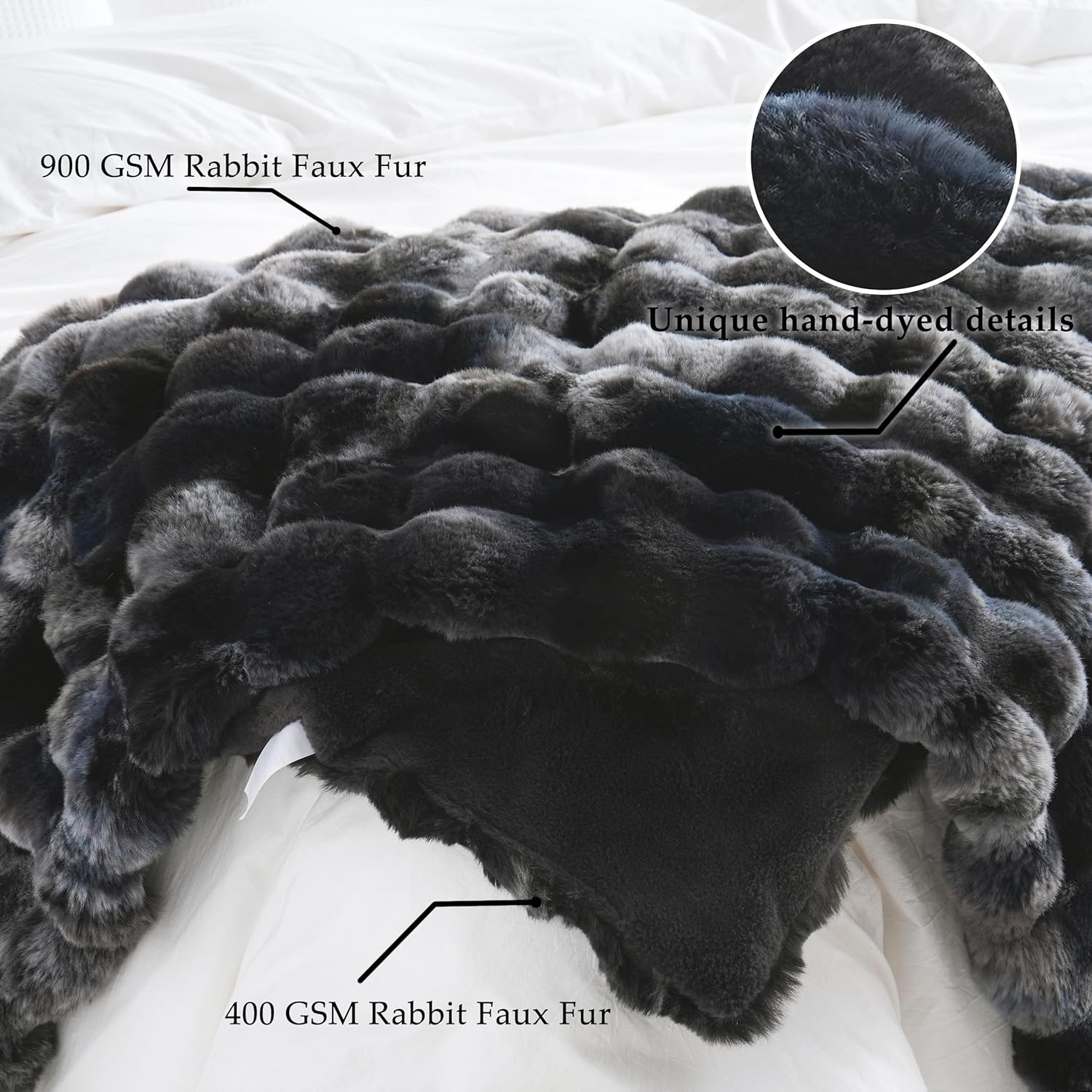 - Luxury Double-Sided Faux Fur: Unlike regular faux fur blankets, ours features double-sided faux rabbit fur. One side showcases a 3D bubble faux fur with a full and dimensional bubble texture, while the other side offers smooth and ultra-soft faux fur. Compared to regular crystal velvet, it's more static-resistant, softer to the touch, and warmer against the skin.