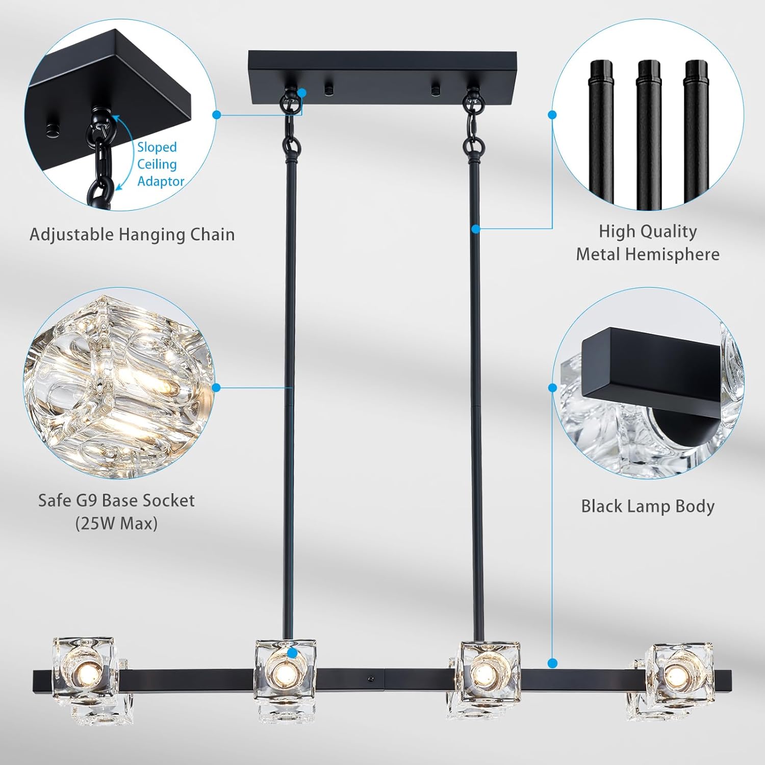 - Adjustable Height Chandelier: Our XINGQI Kitchen Island Pendant Lights come with 8 adjustable light poles, including 2 at 5.9 inches and 6 at 11.8 inches. Tailor the height effortlessly to deliver a personalized ambiance that complements any decor style, adding sophistication to your space