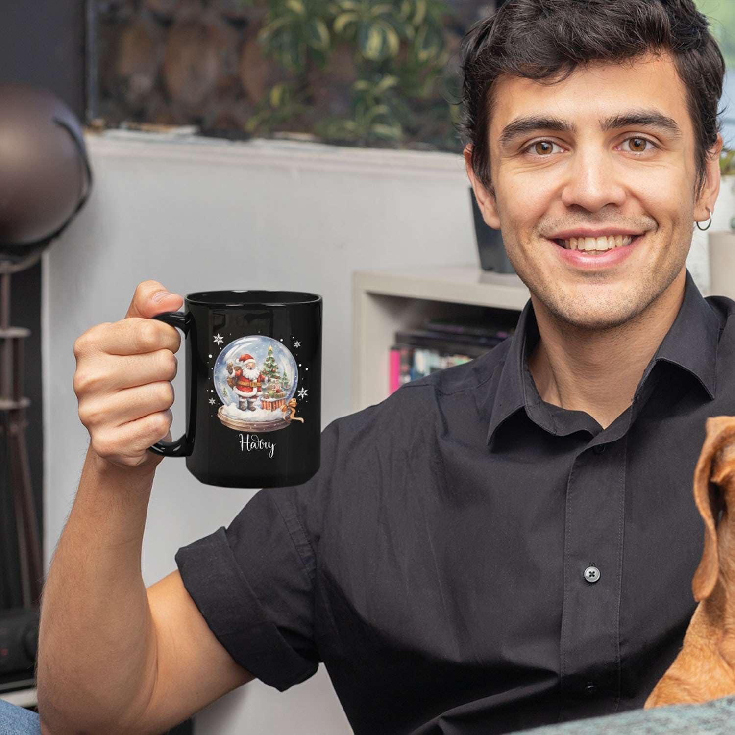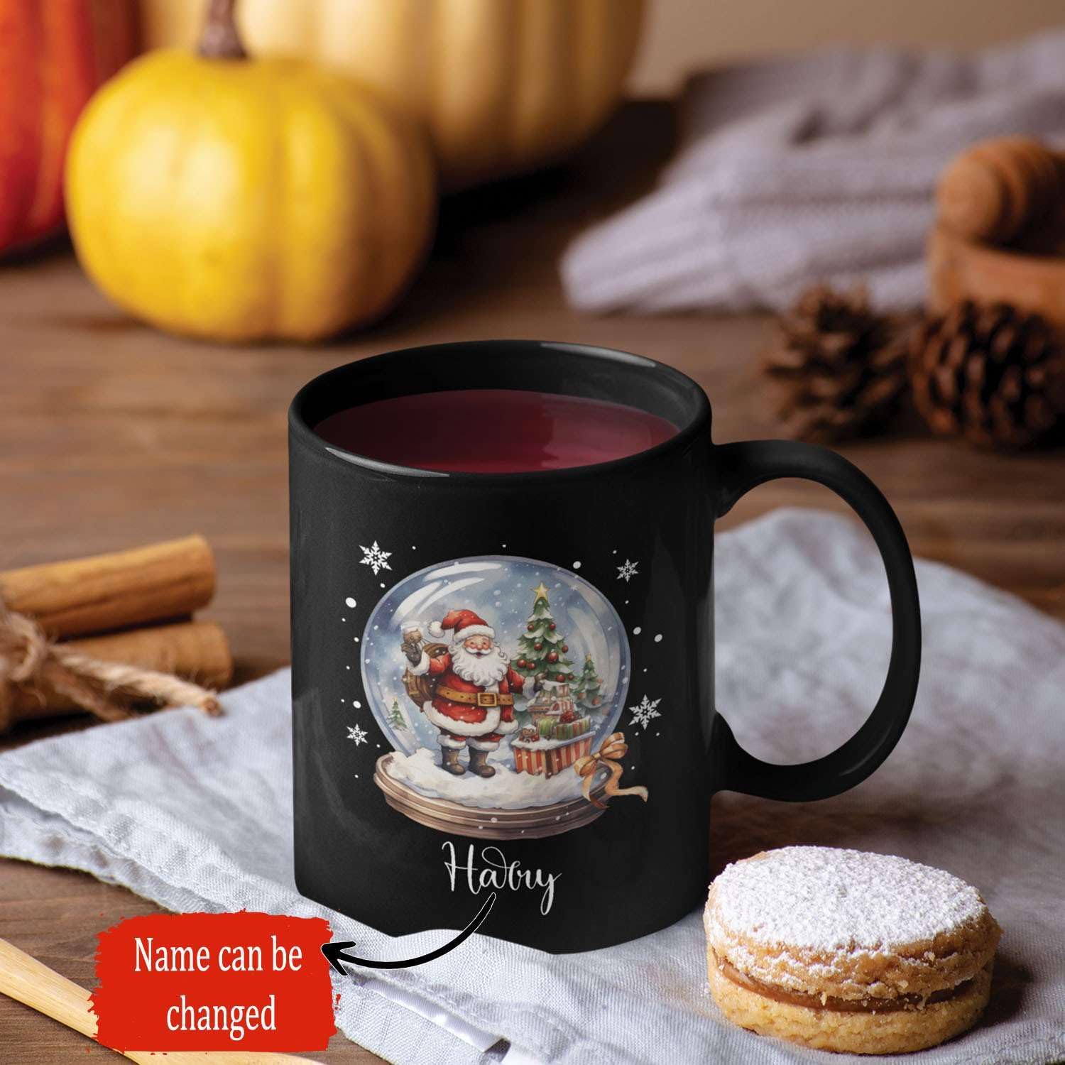 - 💝 UNIQUE DESIGN MUG: Bring holiday joy with this "Custom Snow Ball Design Mug With Name" featuring a festive Santa inside a sparkling snow globe with gifts and a Christmas tree. Click "Customize Now" to personalize with a name and create a unique gift for spreading holiday cheer. This black ceramic mug is ideal for enjoying your favorite seasonal beverages.