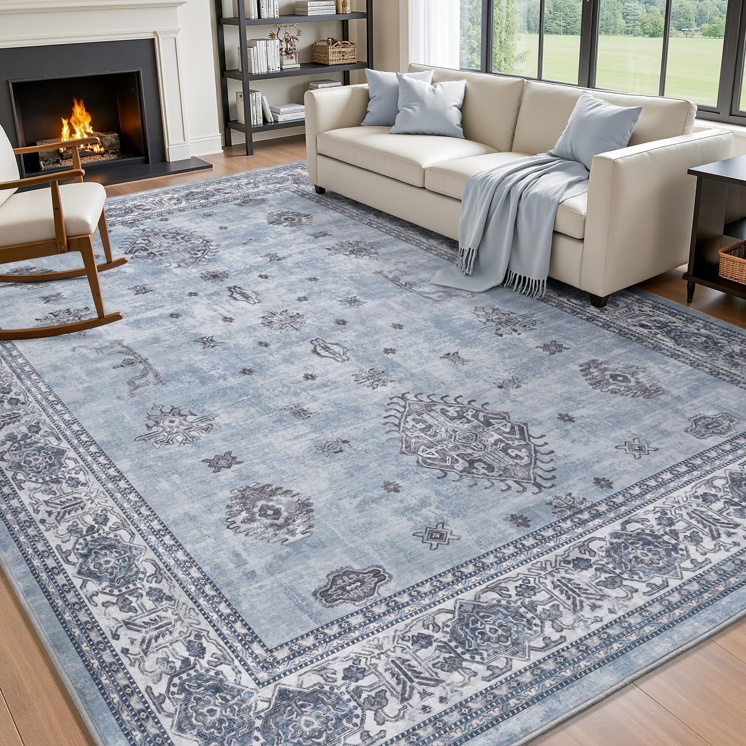 AMOAMI-Vintage Area Rug 8X10 Blue Rugs for Living Room-Soft Living Room Rug Non Slip Rugs for Bedroom Carpet Machine Washable Rug for Dining Room Bedside Office Room Decor