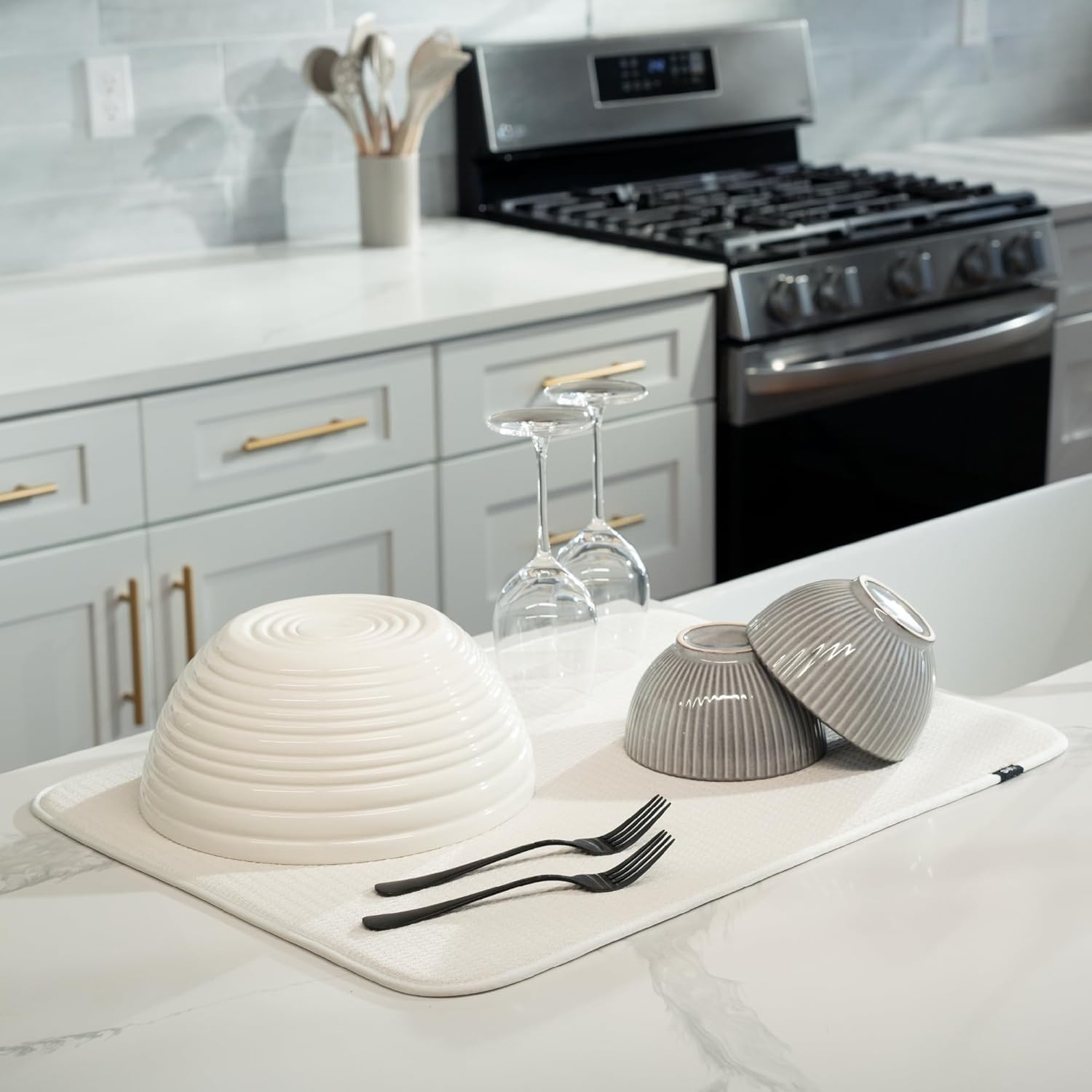 - Catch the kitchen sink drips under a dish drying rack or place your plates, forks, spoons, pots and pans set, or glassware directly on the drying mat