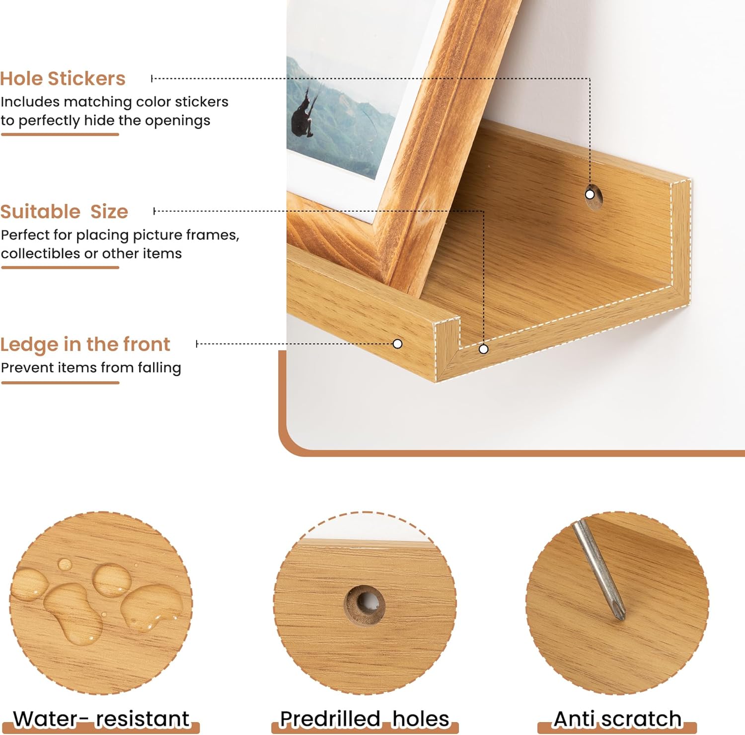 - Enhanced Stability Design: Featuring a secure lip at the front, these floating shelves prevent items from slipping or falling, confidently supporting up to 40 lbs, making these MDF wood shelves ideal for showcasing cherished items.