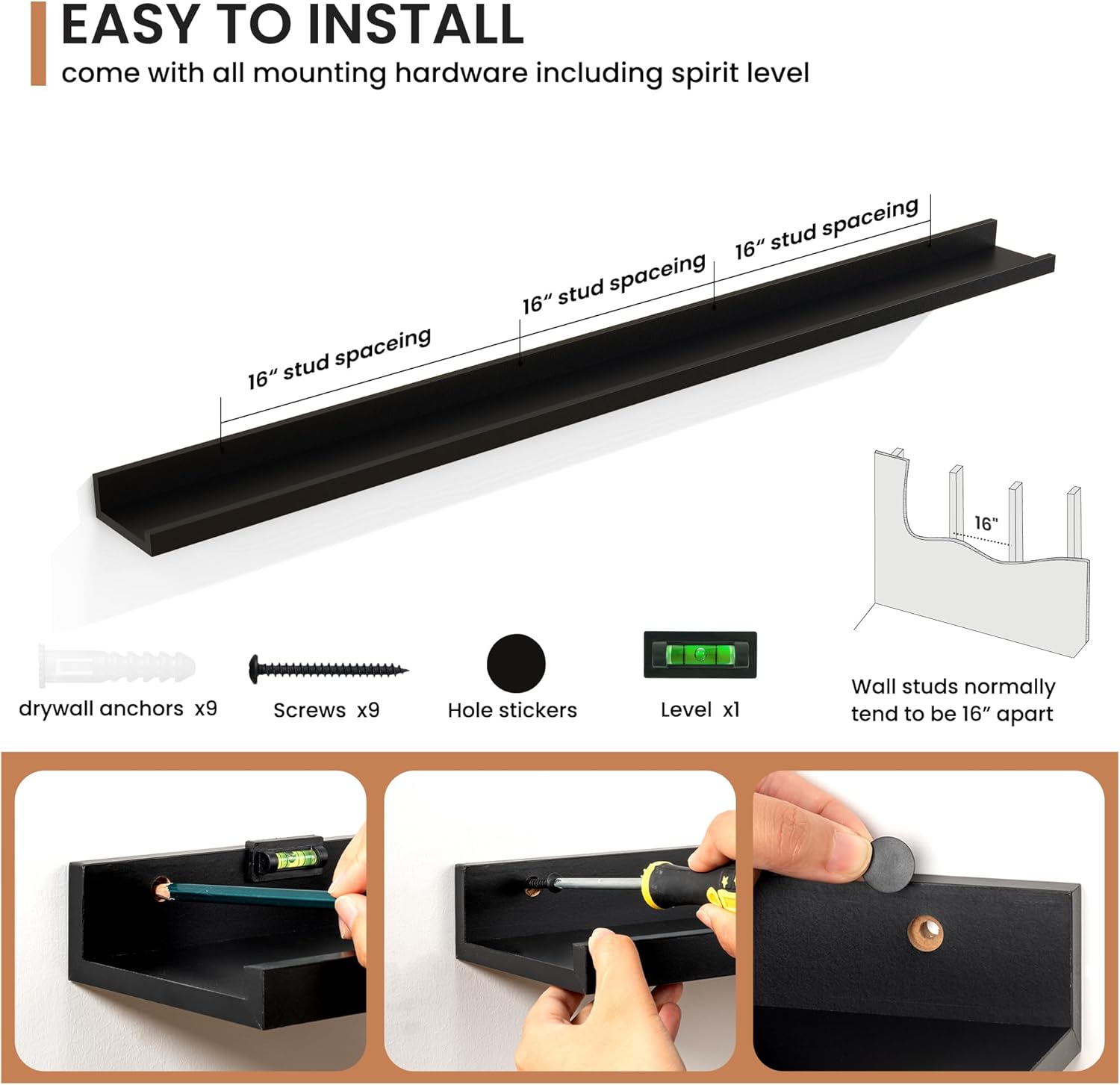 Fun Memories Picture Ledge Shelves Set of 2, 55 Inch Rustic Wall Mounted Floating Shelves with Lip for Home Storage and Décor in Bathroom, Kitchen, Nursery, Bedroom, Living Room, Black