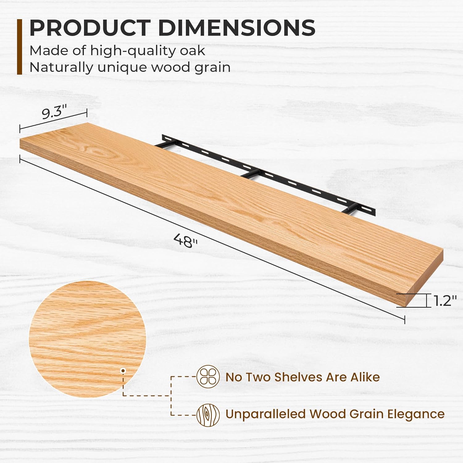 Fun Memories Solid Oak Wood Floating Shelves, 9.3 Inch Deep Natural Wood Shelf with Invisible Heavy Duty Bracket for Bathroom Bedroom Kitchen - 48inch Set of 1, Natural