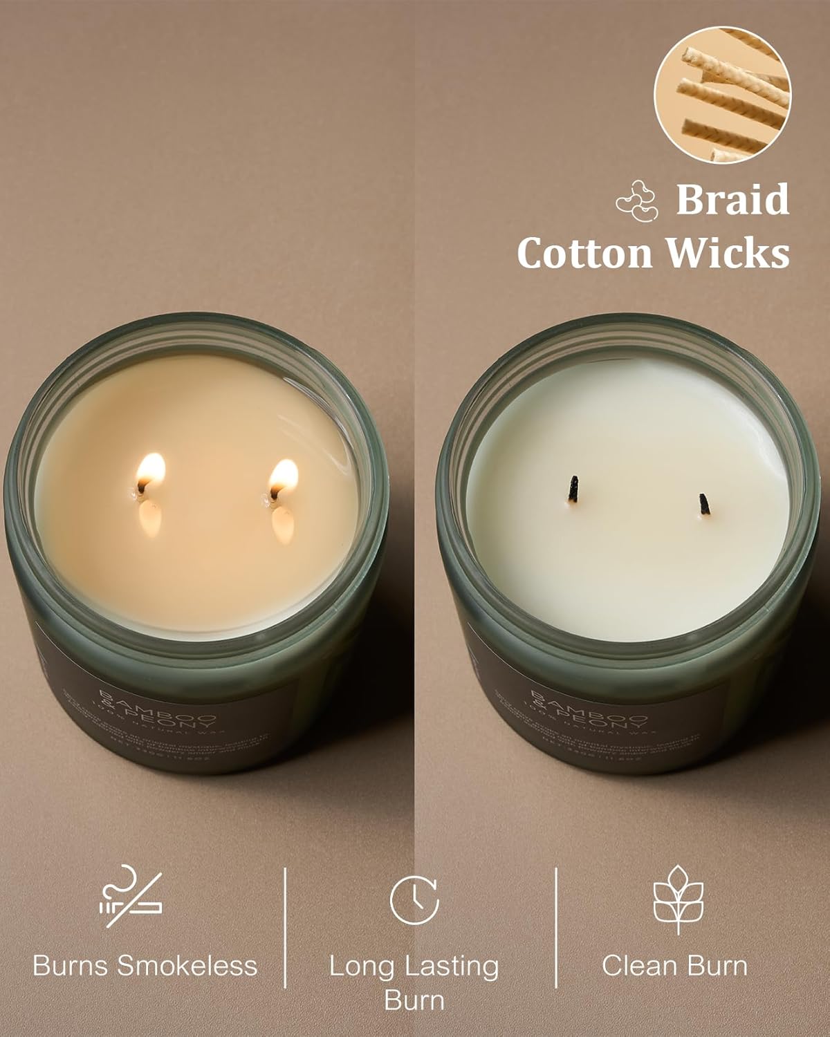 - Clean Consistent & Even Burn - Using 2 American made lead-free cotton wicks for a even burn result. They're cotton flat braid wicks with paper throughout, providing increased rigidity and burn more consistently than 100% cotton wicks. Designed to reduce carbon buildup which leads to black soot.