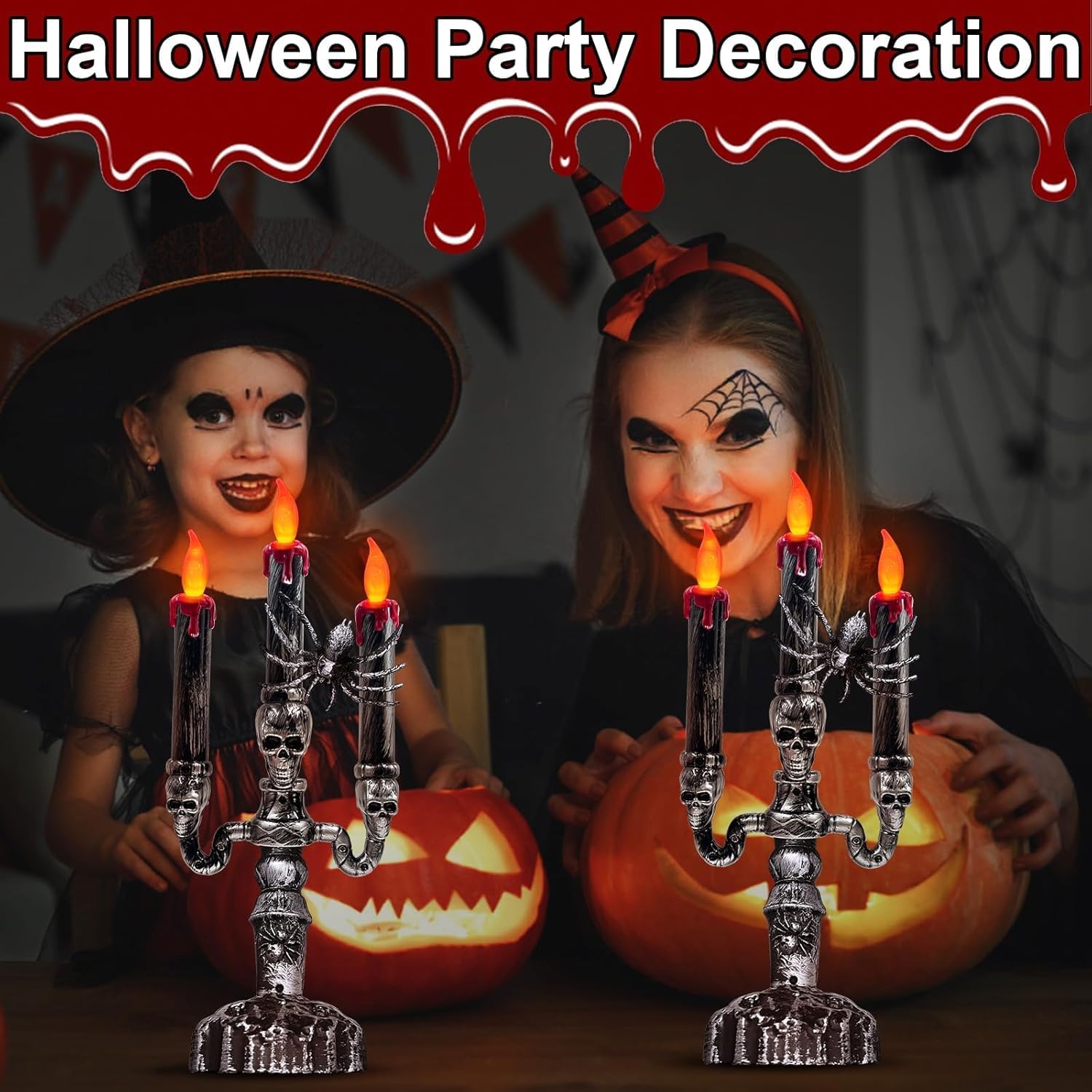 - Three-Head Skull Design with Spiders : The Halloween flame less candles holder stand decorations a creepy 3D skull design with realistic blood drips. The uniqueness design, making them perfect for decorating a memorable and quirky Halloween theme