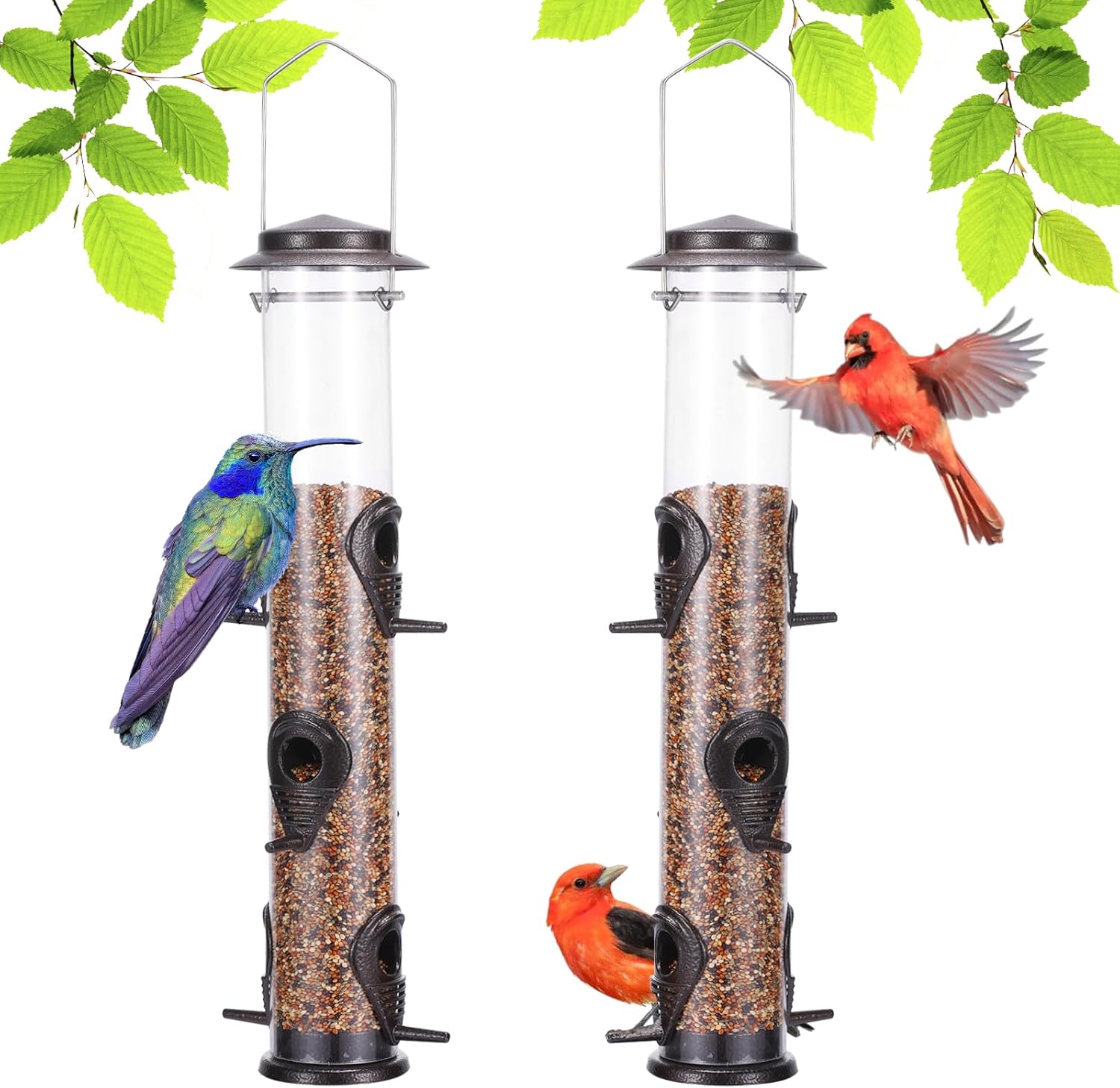 MIXXIDEA 2PK Metal Wild Bird Feeder Squirrel Proof Bird Feeders for Outside Hanging 6 Port Tube Bird Feeder Transparent Finch Feeder with Steel Hanger (Coffee)