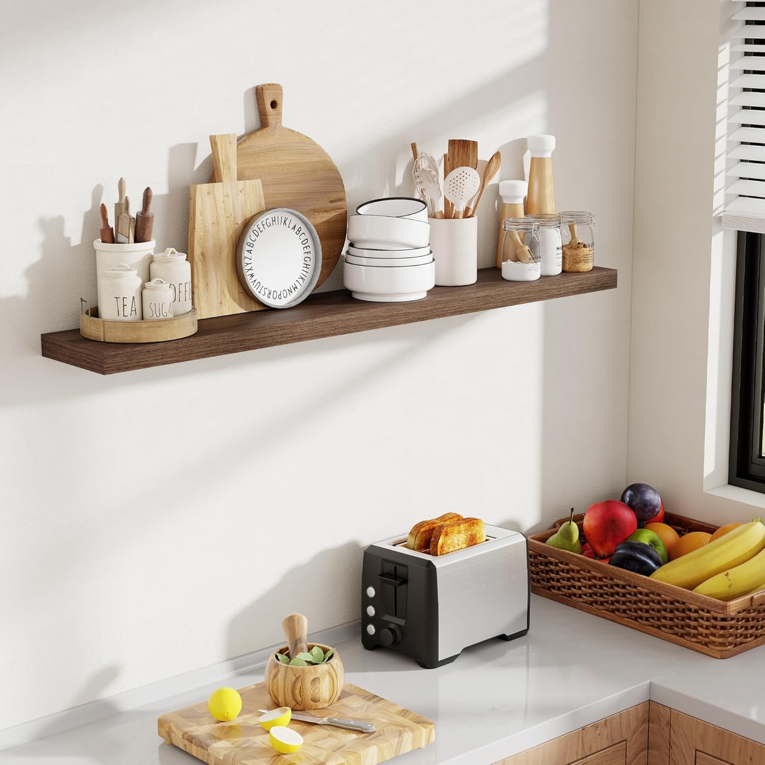 - [STABLE & SECURE INSTALLATION]: Equipped with a robust, hidden mounting bracket, these 48 inche floating shelves provide solid support for your items. Designed for easy, secure installation, they include all necessary hardware for a firm, wobble-free setup, so you can confidently display decor, photos, or functional items with style.