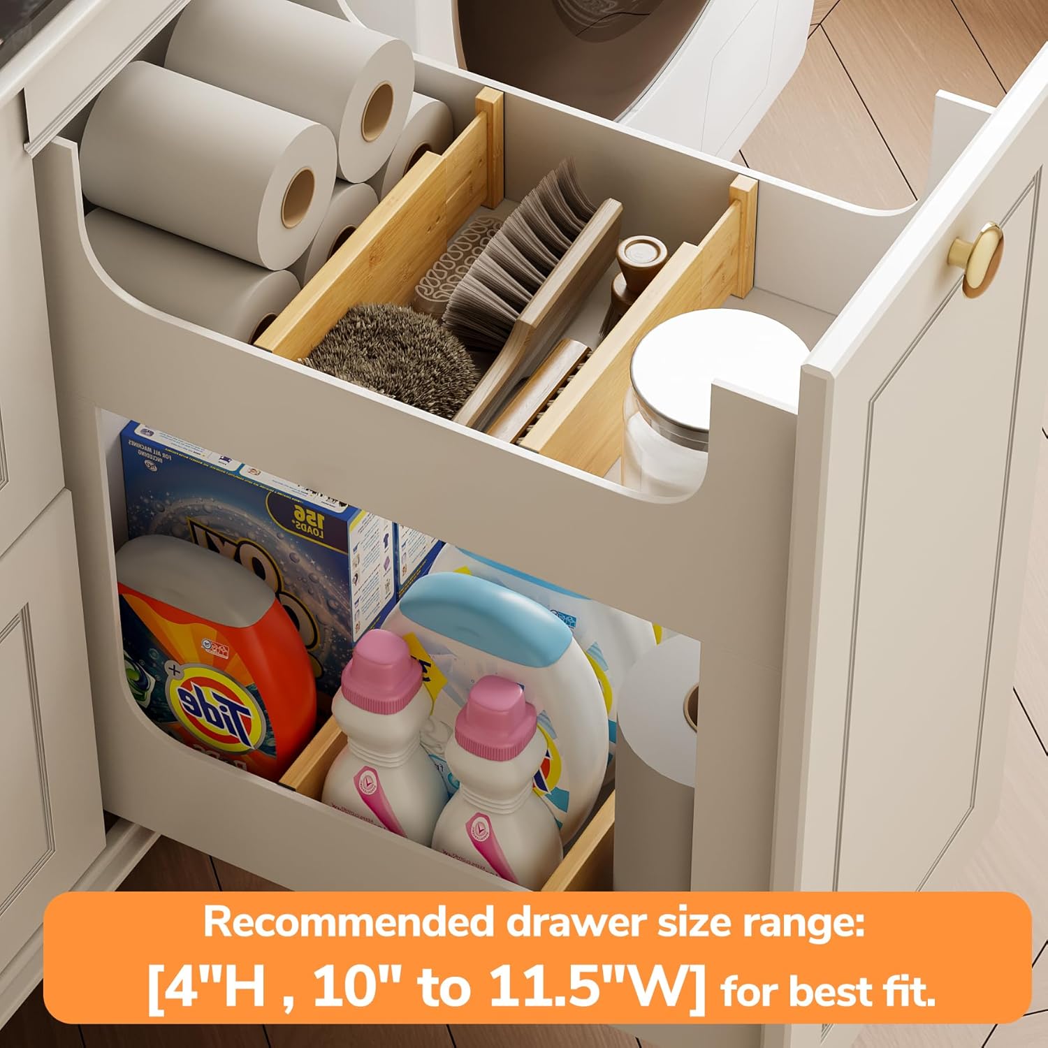 - Expandable design: Each deep drawer divider is 4" H, 0.6"W, and 10" to 12.28"L, which can be adjusted according to the size of the drawer, adapting to different furniture needs. Fits at least 4"H & 10-11.5"W drawers. Do not overstretchāmay reduce elasticity if extended beyond recommended length.