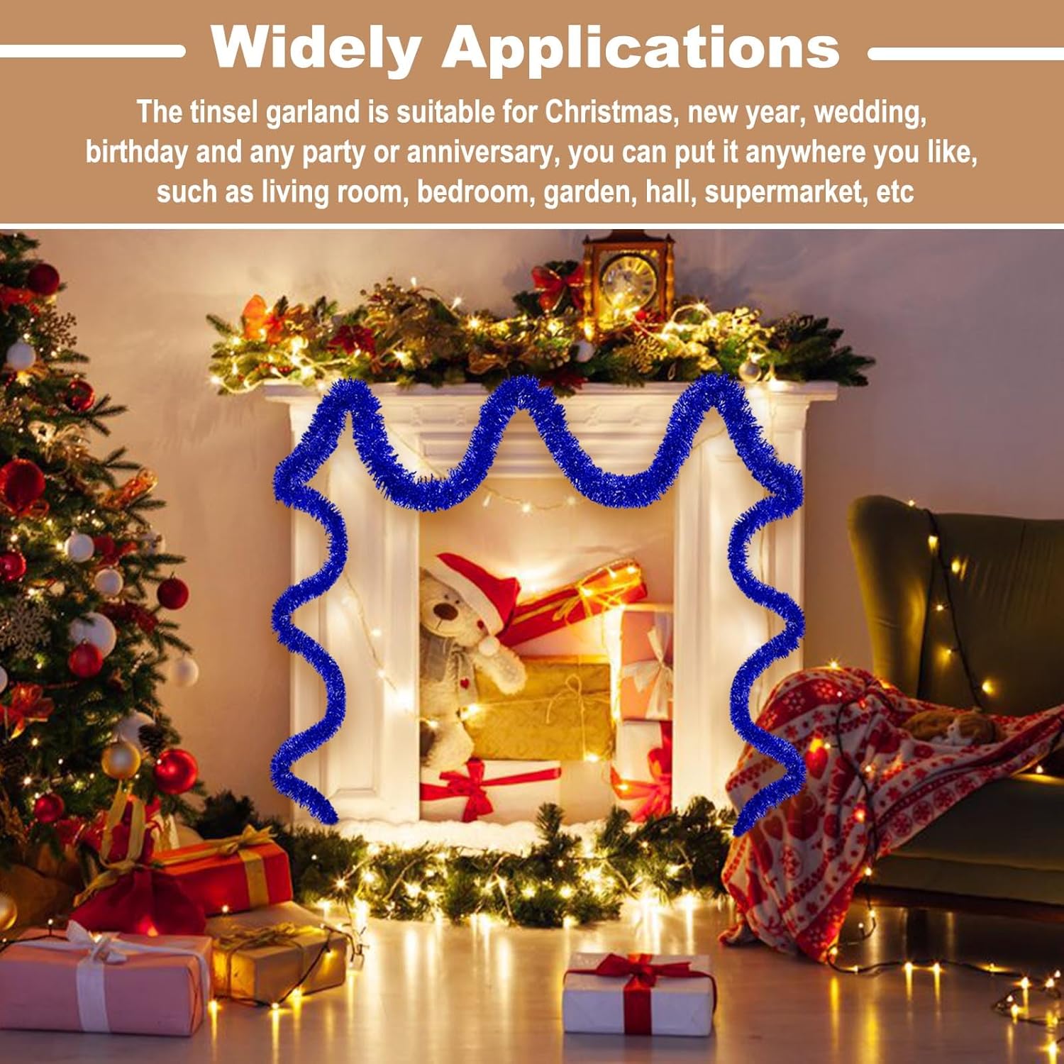 - Wide Application: Suitable for all kinds of special days, such as christmas, new year, valentine's day, halloween, festivals, wedding, engagement, bridal baby shower, graduation celebrations. The tinsel garland are perfect decorations for party, home decorations, parade float, garden, christmas tree, christmas wreath, wall, ceiling, door, hedge, stair rail, doorway, window, pole, table and so on