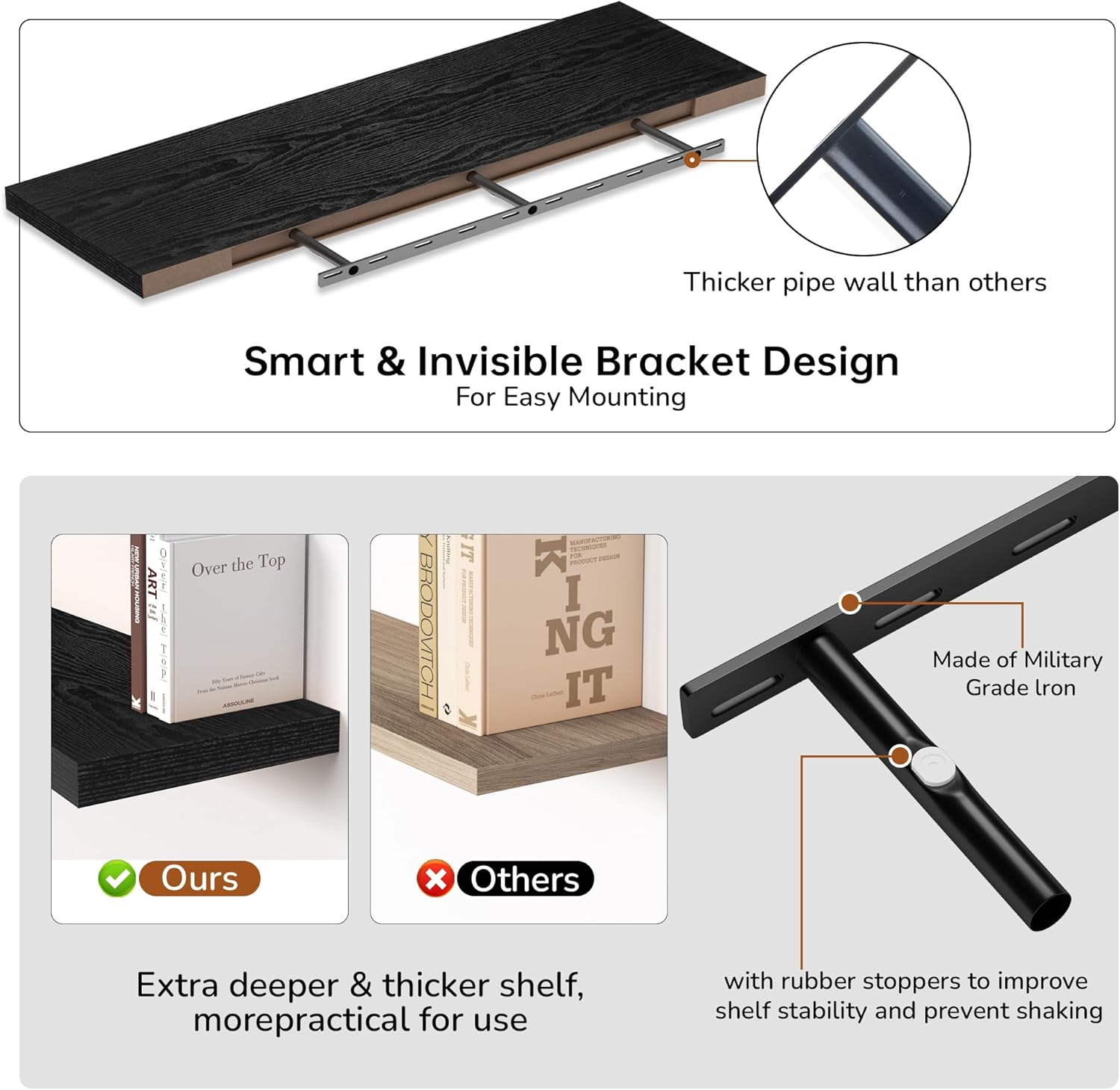 - Extra Deeper & Thicker - Each board measures 55"W x 12"D x 1.8"H. Extra deeper and thicker design in order to bring maximizes storage space and weight capacity, even hold up to 80 lb each. This floating shelf taking up zero square feet, reduces clutter and highlights décor in compact spaces.