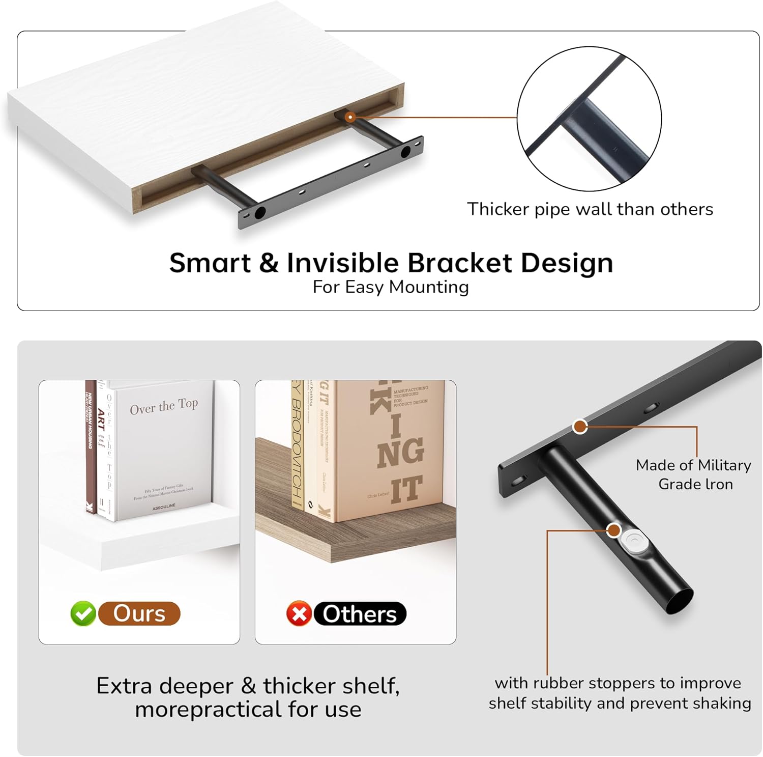 - Extra Deeper & Thicker - Each board measures 16"W x 12"D x 1.5"H. Extra deeper and thicker design in order to bring maximizes storage space and weight capacity, even hold up to 30 lb each. This floating shelf taking up zero square feet, reduces clutter and highlights décor in compact spaces.