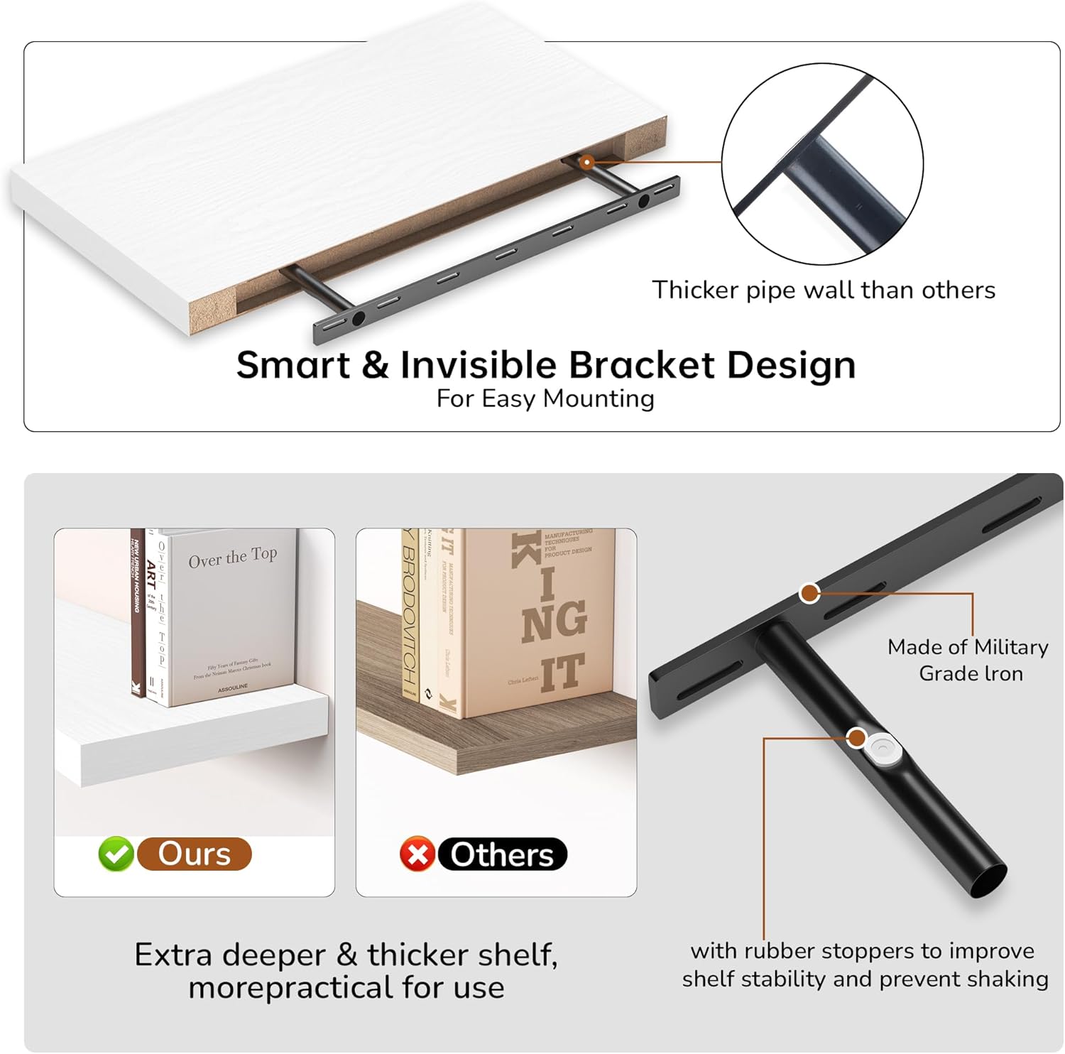 - Extra Deeper & Thicker - Each board measures 24"W x 12"D x 1.5"H. Extra deeper and thicker design in order to bring maximizes storage space and weight capacity, even hold up to 50 lb each. This floating shelf taking up zero square feet, reduces clutter and highlights décor in compact spaces.