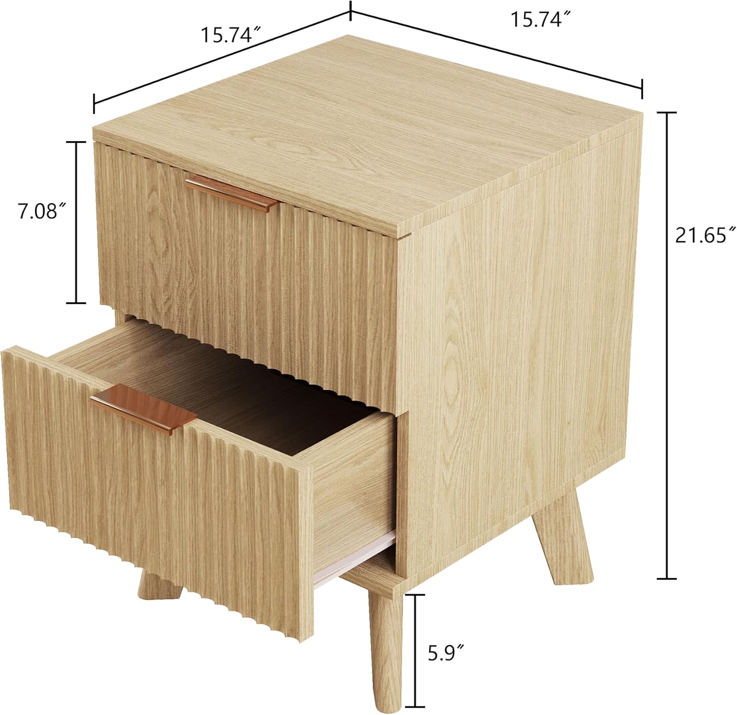 Fluted Nightstand, Mid Century Modern 2 Drawer Bedside Table for Bedroom, Small Dresser Night Stand Side End Table with Wood Fluted Drawer Storage for Bedroom Closet(Natural)
