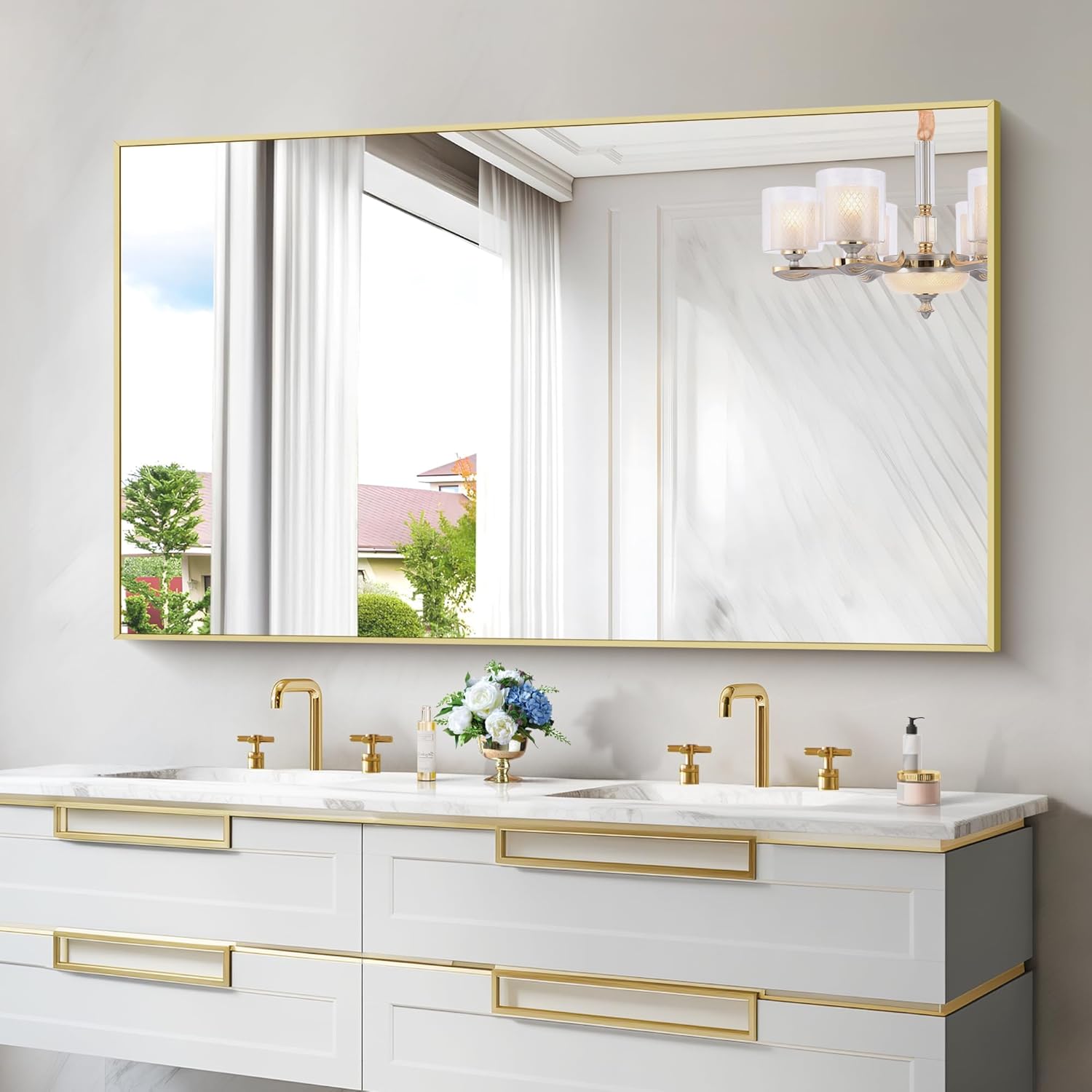 - SAFE USE: Brushed Gold bathroom Mirror safety backing strengthens the glass surface, making it less prone to breakage and falling off, you can use it with confidence, the mirror design is simple, and the universal size can adorn your room well.