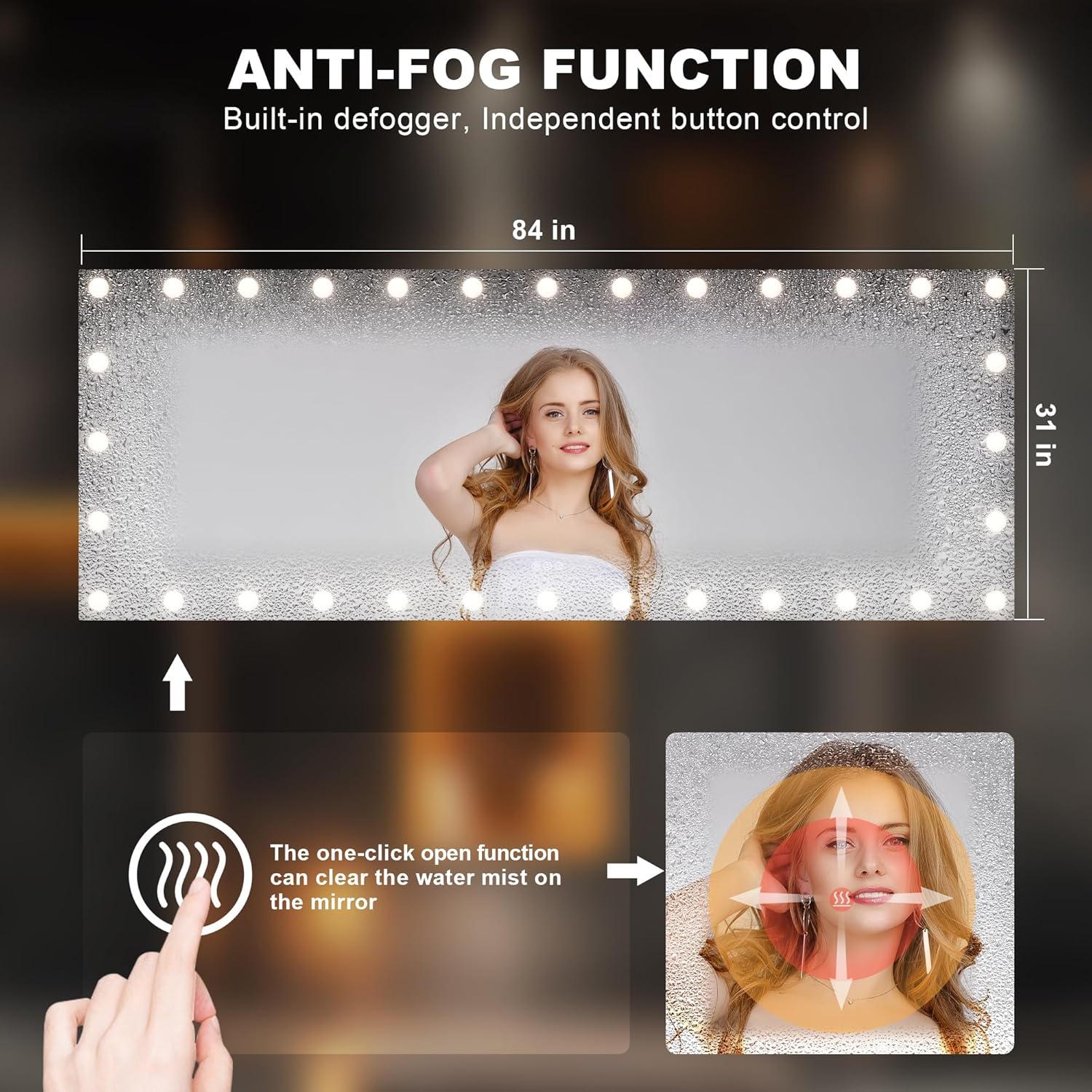 - 【Upgraded Anti-Fog & Smart Touch Screen】 Our bathroom mirror features an enhanced anti-fog function with a large heating film for faster fog removal, ensuring a clear reflection after your shower. The smart touch screen allows easy control of lights, color modes, and brightness, offering a sleek and convenient experience.