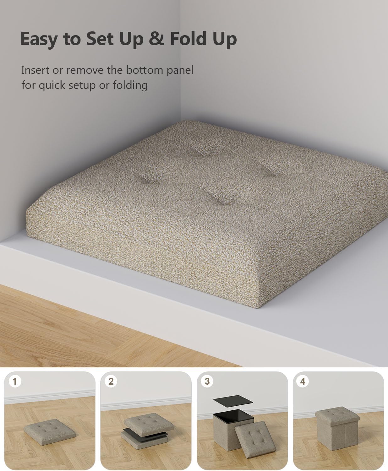 15 Inches Small Folding Storage Ottoman Cube, Storage Footrest, Foot Rest Stool, for Living Room, Bedroom, Dorm, Hallway, Entryway, Sandy Beige