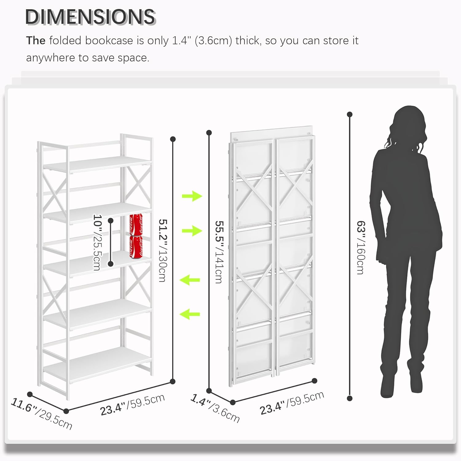 4NM 5 Tiers No Assembly Book Shelves, 51.2" H Folding Bookshelf Bookcase Open Industrial Foldable Shelves for Bedroom, Living Room, Home Office - All White