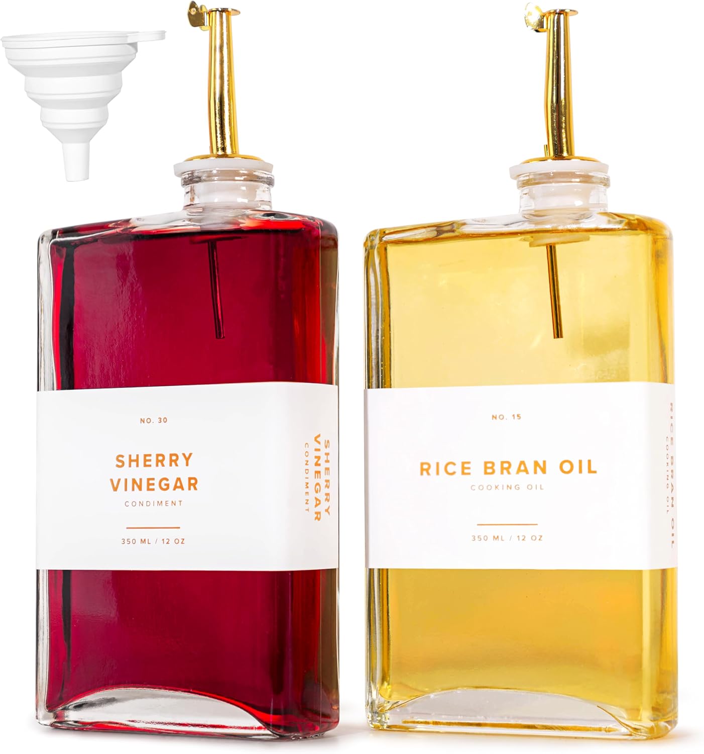 - ELEGANT GLASS OIL DISPENSER FOR KITCHEN: This premium oil and vinegar dispenser set includes two 12oz glass oil bottles for kitchen, designed to keep your favorite oils and vinegars fresh while adding a sleek touch to your kitchen.