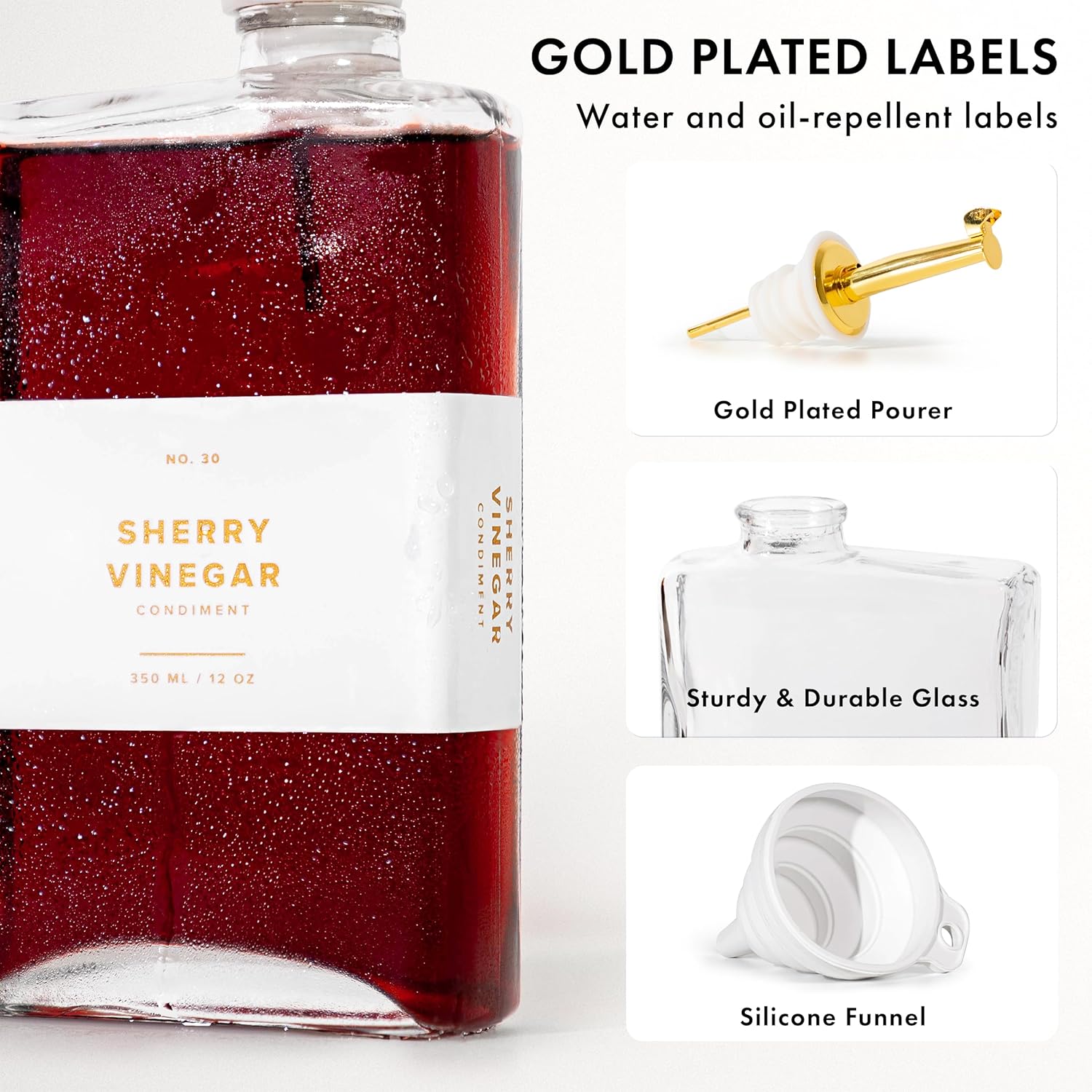 Glass Olive Oil Dispenser Bottle Set [4x12oz]: 36 Premium Gold Labels, Oil Dispenser for kitchen, Vinegar Bottle Set, Glass Dispensers for Soy Sauce, Syrup Bottles | Set of 4