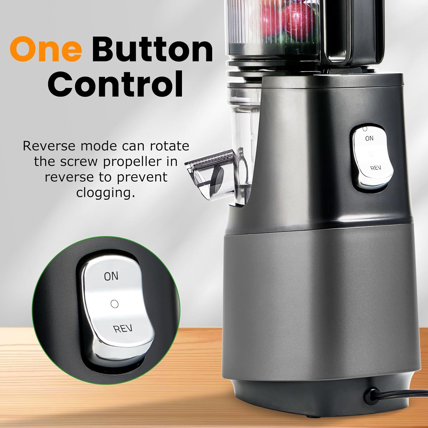 - 【ONE BUTTON CONTROL】One-button design makes your juicing process as simple as possible. There is a reverse mode, if the blockage occurs in the juicing process, just filpping the button can make the juicer rotate in the opposite direction, clear the blockage, and ensure that the juicing is uninterrupted. In the juicing process, if the lid is accidentally opened, the masticating juicer will automatically stop working, and the juicer will not start if the lid is not covered, to ensure the safety of the user