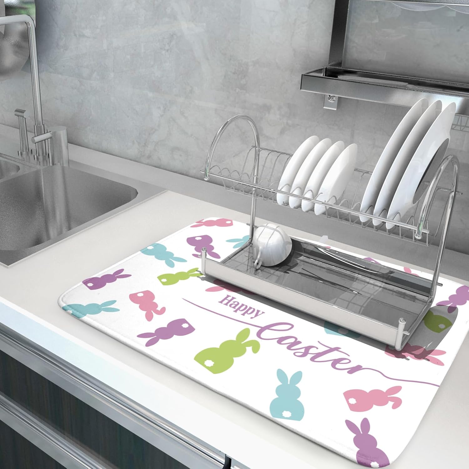 Easter Dish Drying Mat for Kitchen Counter Colorful Bunny Rabbit Festival Holiday Seasonal Absorbent Reversible Microfiber Kitchen Countertop Protector Dishes Pad Large 18x24 inch