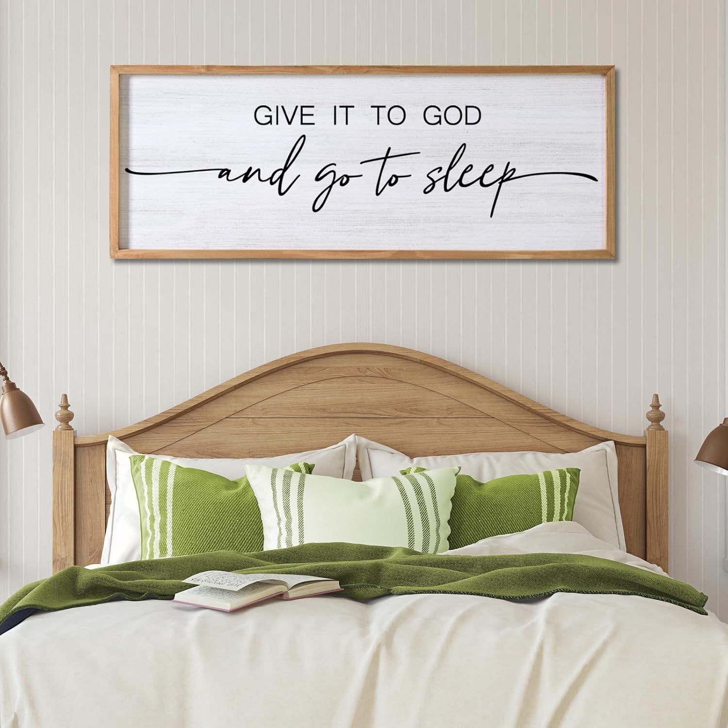- 【High-quality Solid Wood】The aesthetic motivational give it to god and go to sleep saying wall decor above bed is handcrafted of high-quality solid wood with a distressed finish, white text design, and natural solid wood frame, which is simple and durable, not easy to fade and deform, and can accompany you and your lover for a long time, witnessing the sweetness of love.
