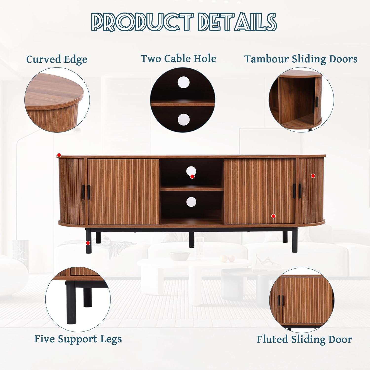 - Ample Storage Space: With a total of six thoughtfully designed storage compartments, this entertainment center features two stylish tambour doors on each side and two central sliding doors. This clever configuration allows for easy organization of all your entertainment essentials, including gaming consoles, DVDs, and decor items, ensuring everything is neatly tucked away yet easily accessible.