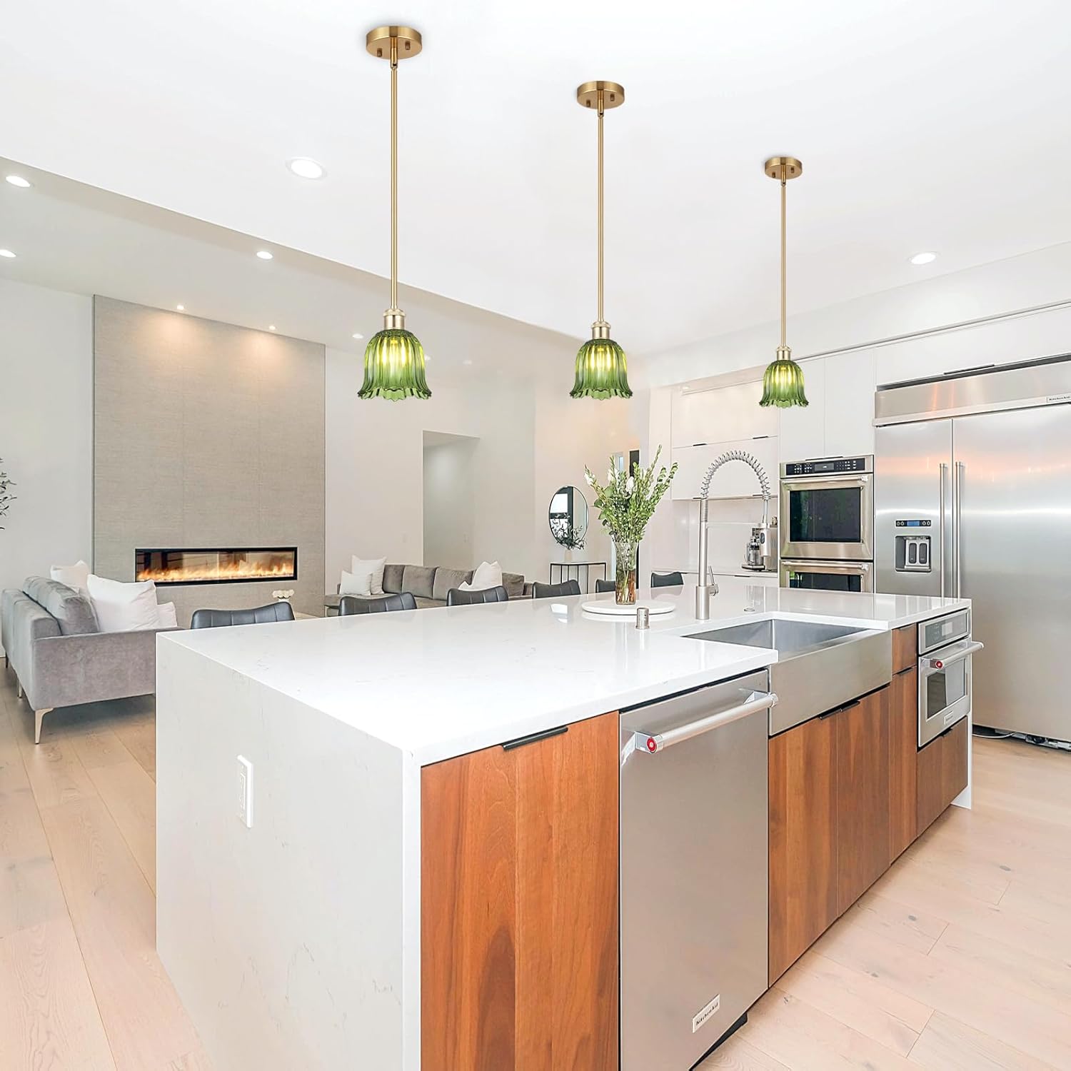 Modern Gold Pendant Light 3 Pack Brushed Brass Mid Century Chandelier Green Glass Shades Adjustable Rods Farmhouse Ceiling Hanging Lighting Fixture Kitchen Island Dining Room Bedroom