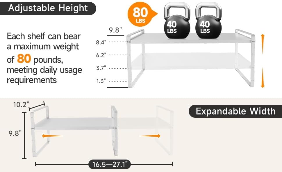 - Easy Installation and Stronger Build: The Cabinet Shelf Organizers are made of sturdy steel and coated with an eco-friendly finish that is rust-resistant, easy to clean, and prevents corrosion. The design includes additional support points on the sides for better stability and a weight capacity of up to 80 pounds.