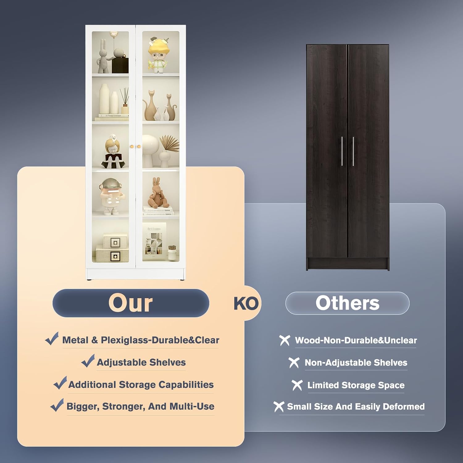 - Storage Cabinets for Multiple Purposesļ¼A nice dust proof display cabinet to store a variety of books, collectibles, dishes and more. This steel storage cabinet can be used as a display cabinet for curios, books, artwork in your living room. It can also be used as a glass display cabinet, bookshelf, media cabinet, miscellaneous cabinet in office, bathroom, kitchen etc. With local warehouses in USA, we are able to provide fast deliveries.