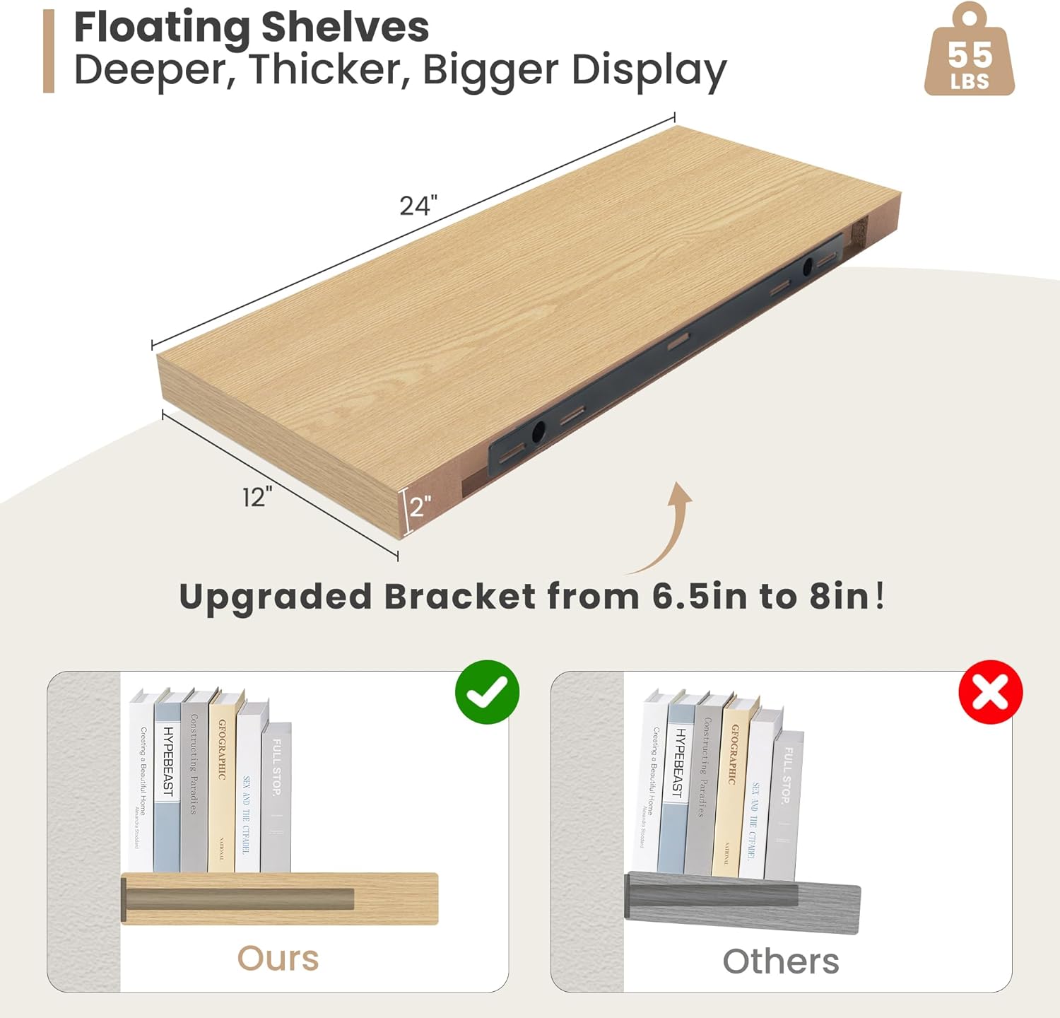 - Deep Floating Shelves- Sized in 24"L x 12"D x 2" H. These extra deeper and thicker wall shelves are 12 inches in depth and 2 inches in thickness instead of the regular narrow floating shelves, wall floating shelves are fixed with solid dual-pipe iron stands and a stable wall shelf It is an ideal place to display your beloved photos, trophies, and other delicate decorations.
