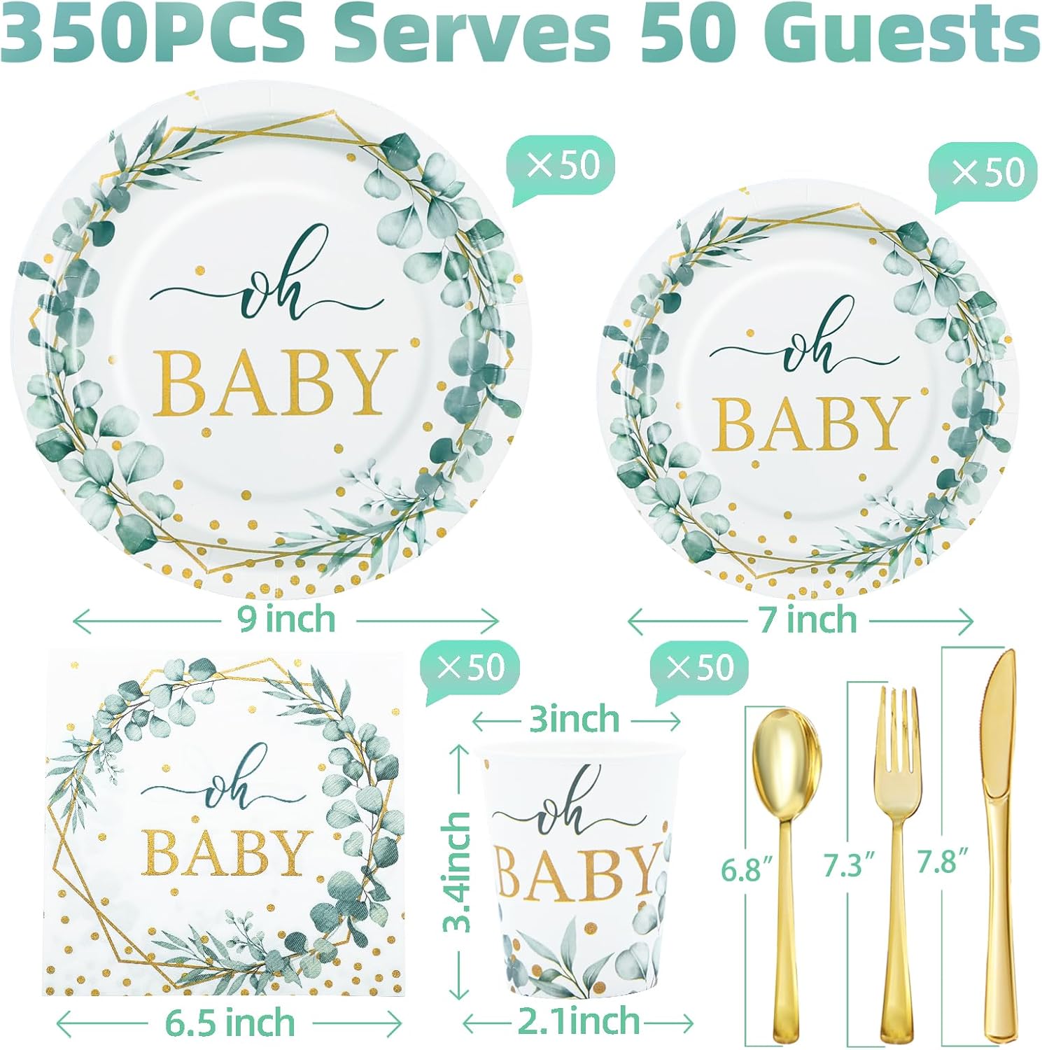 - 【Baby Boy Shower Decorations】- Oh baby baby shower decorations include 50 9 inch baby shower plates, 50 7-inch sage green baby shower plates, 50 baby shower cups, 50 baby shower napkins, 50 sets of plastic utensils (forks, spoons, knives), 350 pieces in total.