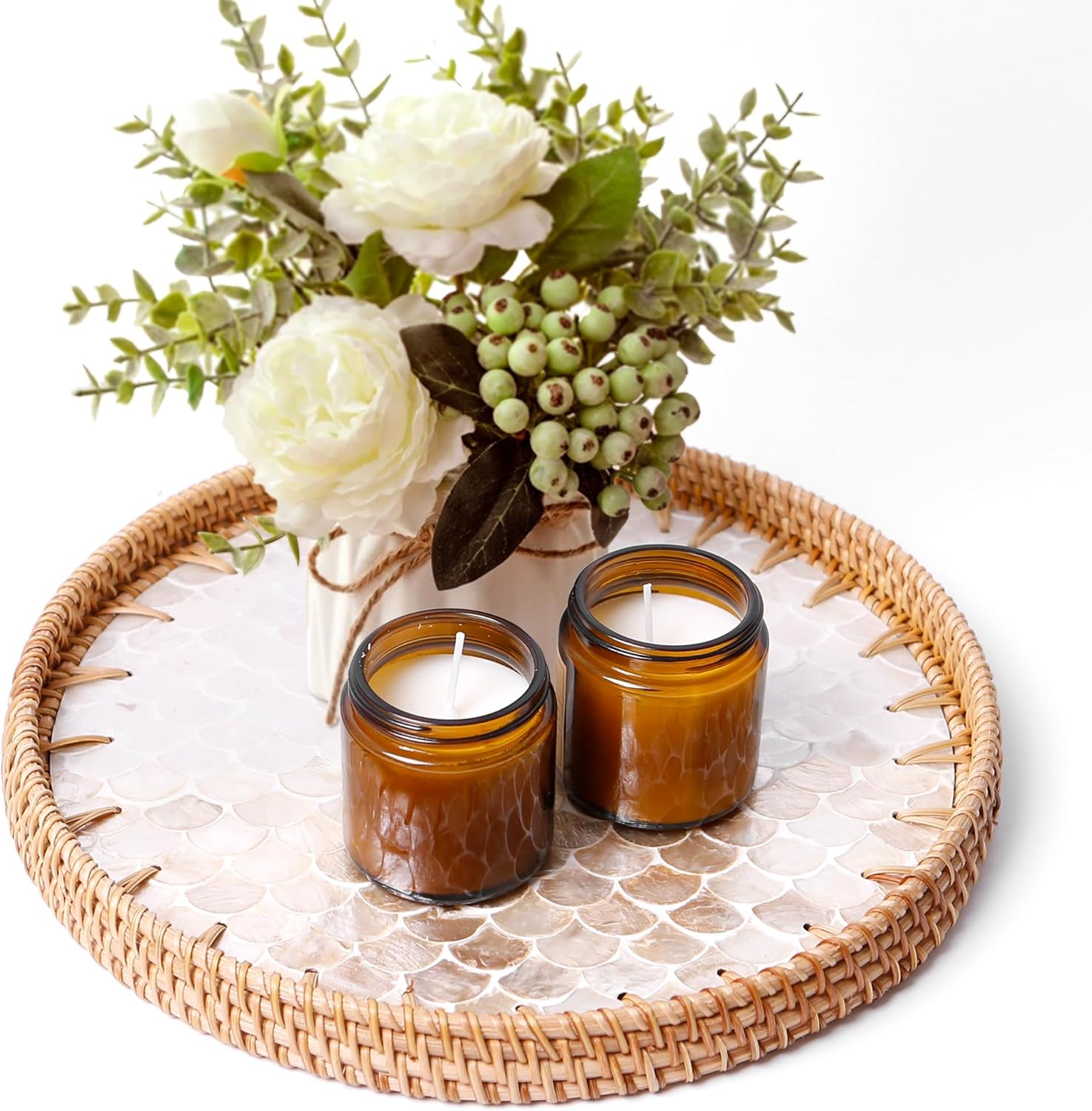 - Natural Rattan and Seashell Design: This tray is crafted from high-quality natural rattan, handwoven with beautiful seashell inlays at the base, showcasing a blend of natural materials and artistic craftsmanship