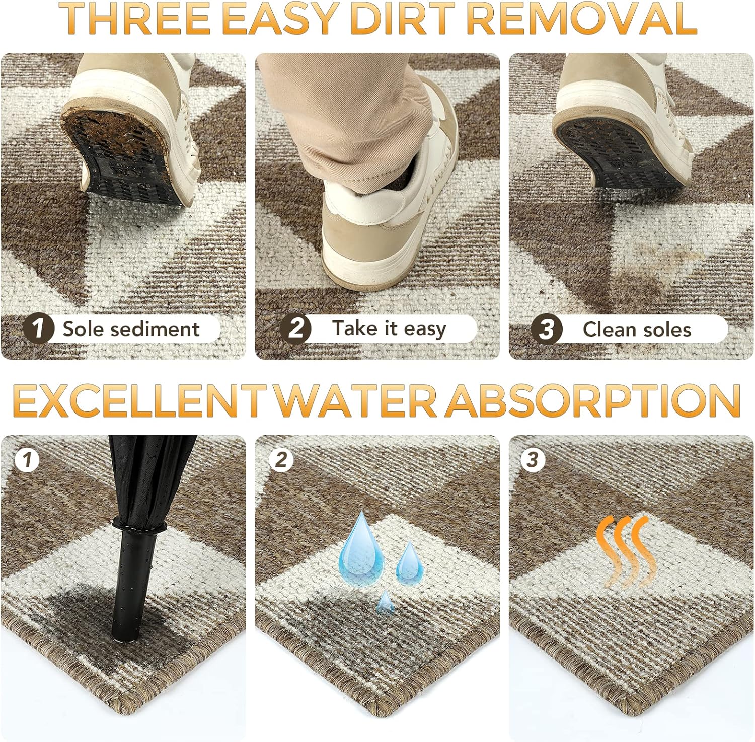 • EASY TO CLEAN: The unique rib fabric design removes dirt from shoes easily. When your doormat gets dirty, first shake it off outdoors or over your garbage bins, then sweep with a broom or vacuum regularly or use a garden hose to rinse the mat outdoors. For deeper clean: machine washable, use water under 86 (℉) / 30 (℃). Do not iron. Do not bleach. Do not expose it to the sun for a long time.