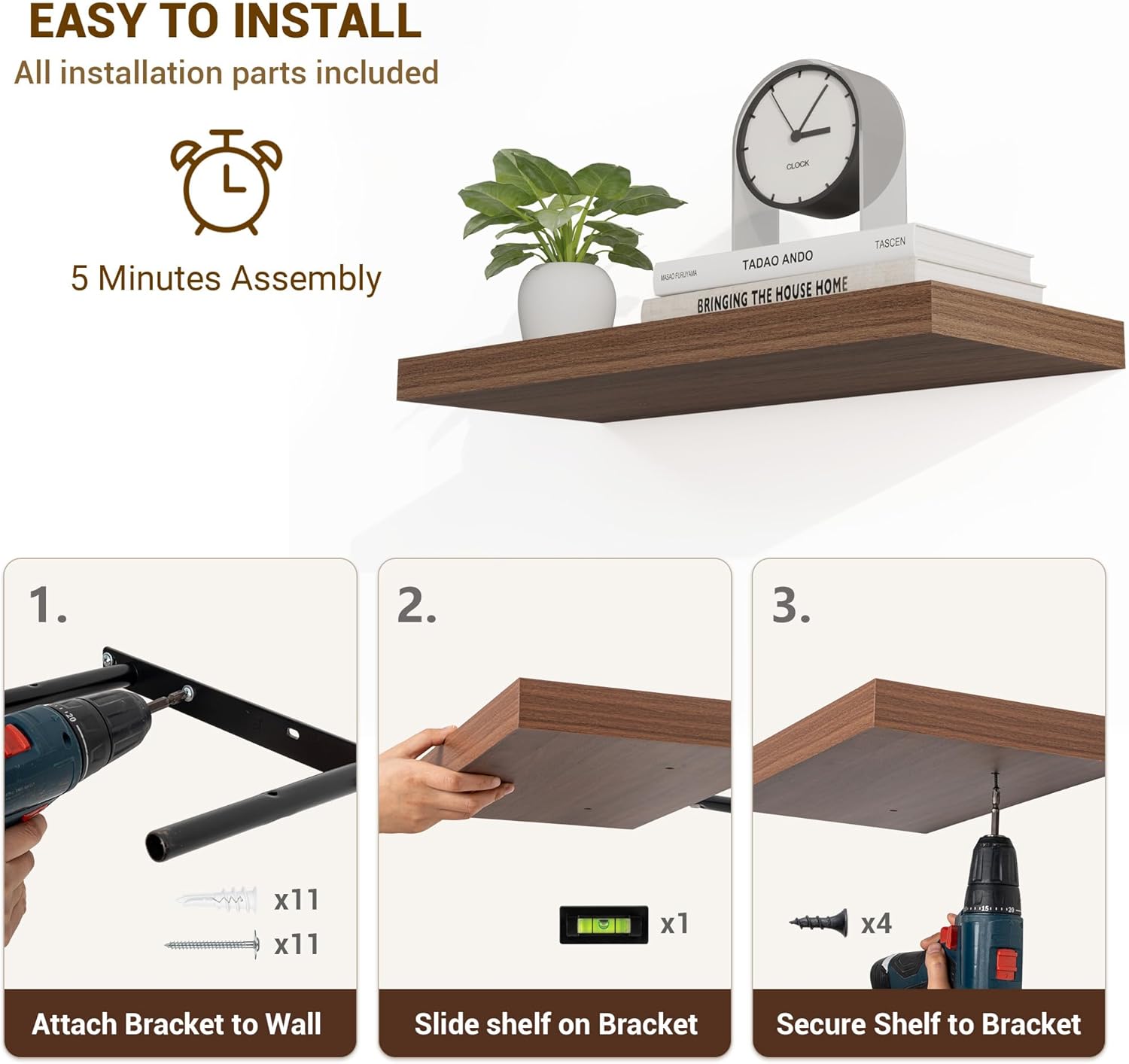 - ćEasy InstallationćDesigned with user convenience in mind, these shelves come with all necessary mounting hardware and clear instructions. You can have them up and ready to use in less than 5 minutes. Plus, our customer service is always ready to assist with any queries or concerns, ensuring a hassle-free experience