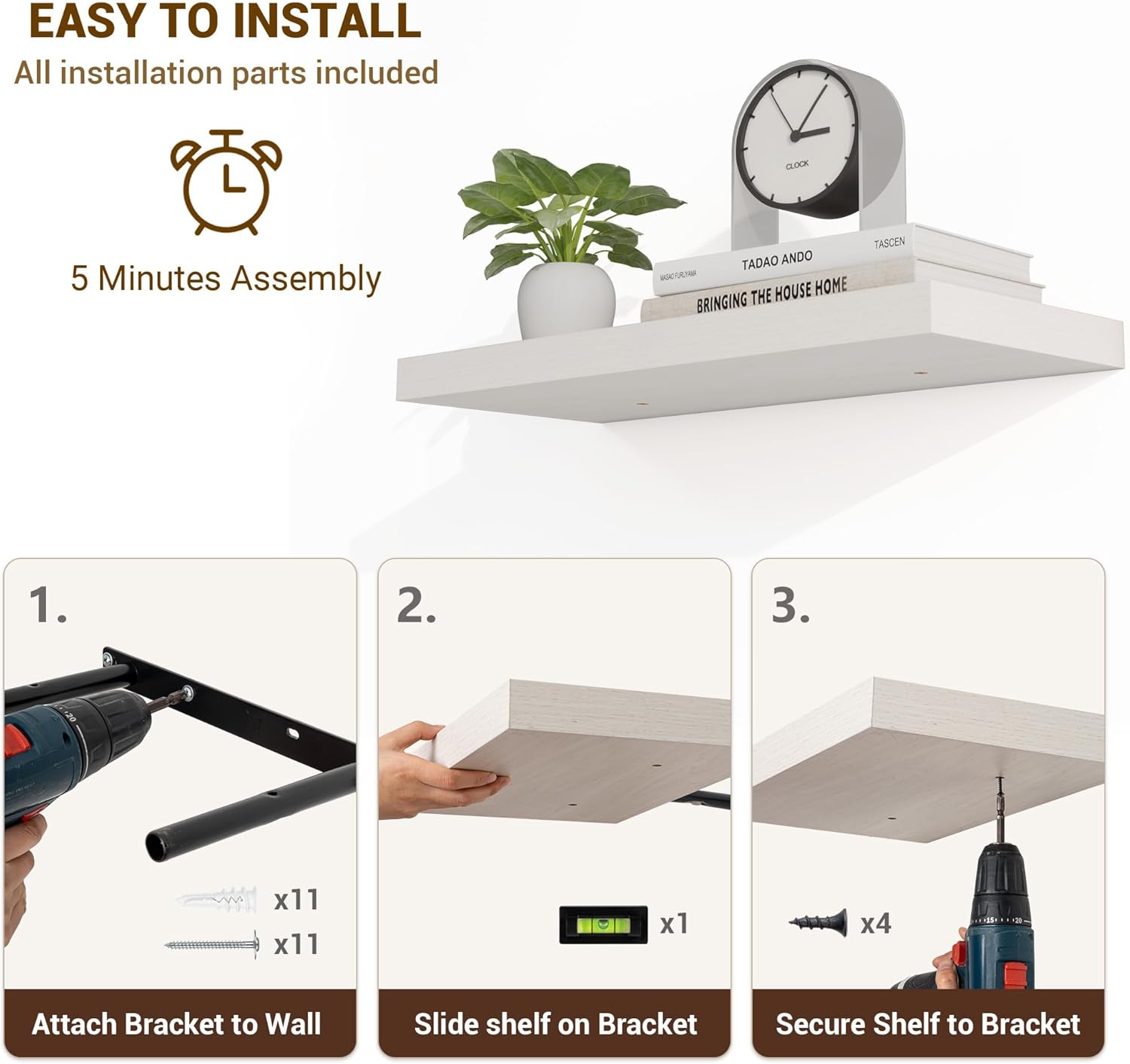 - ćEasy InstallationćDesigned with user convenience in mind, these shelves come with all necessary mounting hardware and clear instructions. You can have them up and ready to use in less than 5 minutes. Plus, our customer service is always ready to assist with any queries or concerns, ensuring a hassle-free experience