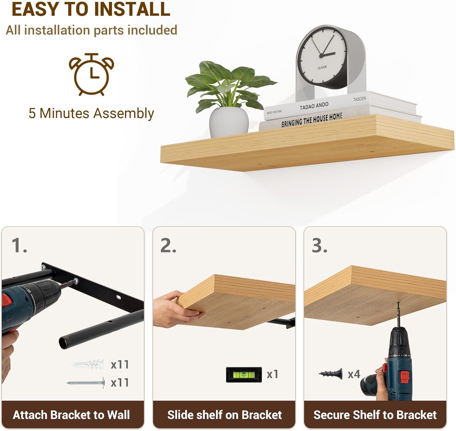- ćEasy InstallationćDesigned with user convenience in mind, these shelves come with all necessary mounting hardware and clear instructions. You can have them up and ready to use in less than 5 minutes. Plus, our customer service is always ready to assist with any queries or concerns, ensuring a hassle-free experience