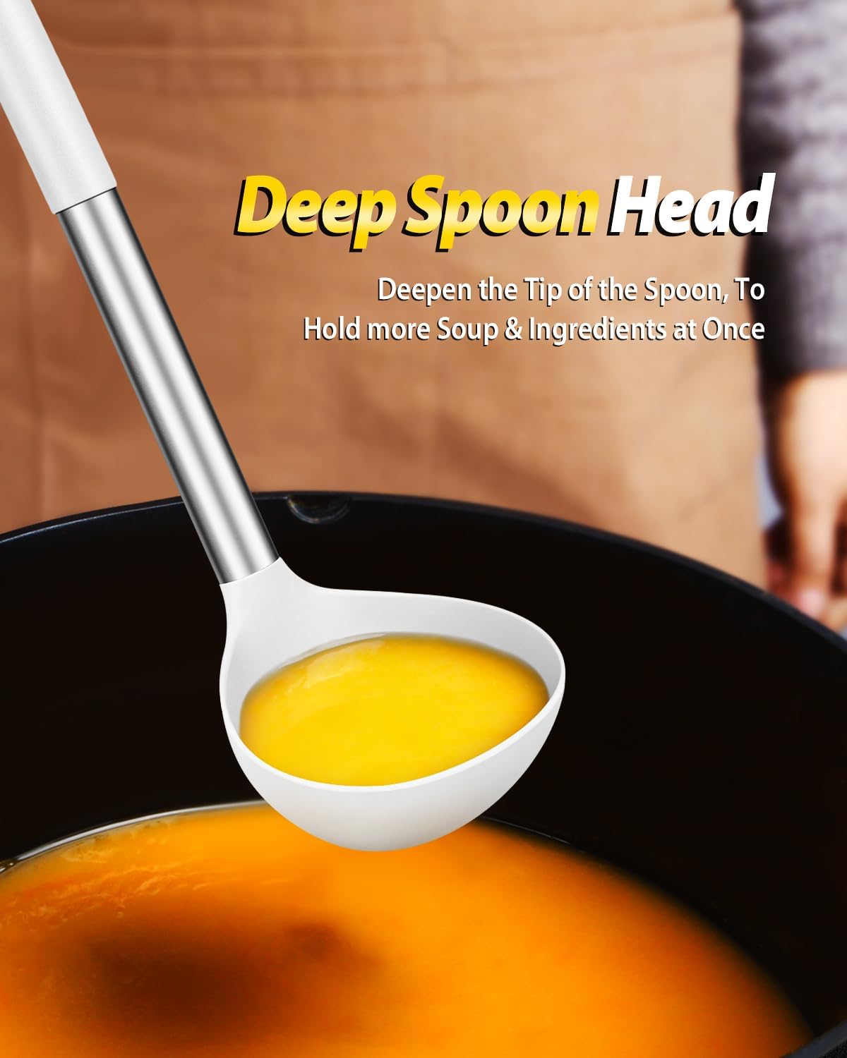Silicone Pasta Fork and Ladle Spoon Set, Large Non Stick Kitchen Utensils for Cooking,Stirring,Serving Spaghetti, Soup, Sauce (WHITE)