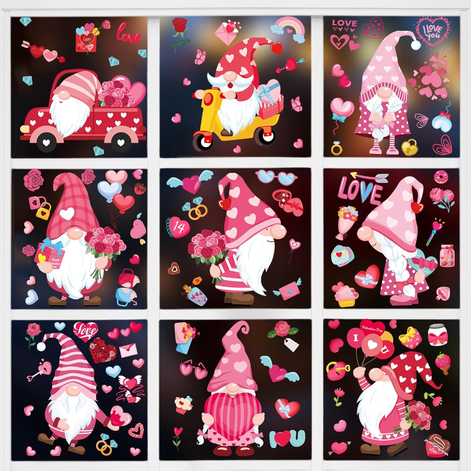 - šValentine Decoration Window Decalsš: This Valentines Day window decoration set includes 9 sheets static Valentine window stickers, totally 107 pcs romantic stickers of different size and elements.