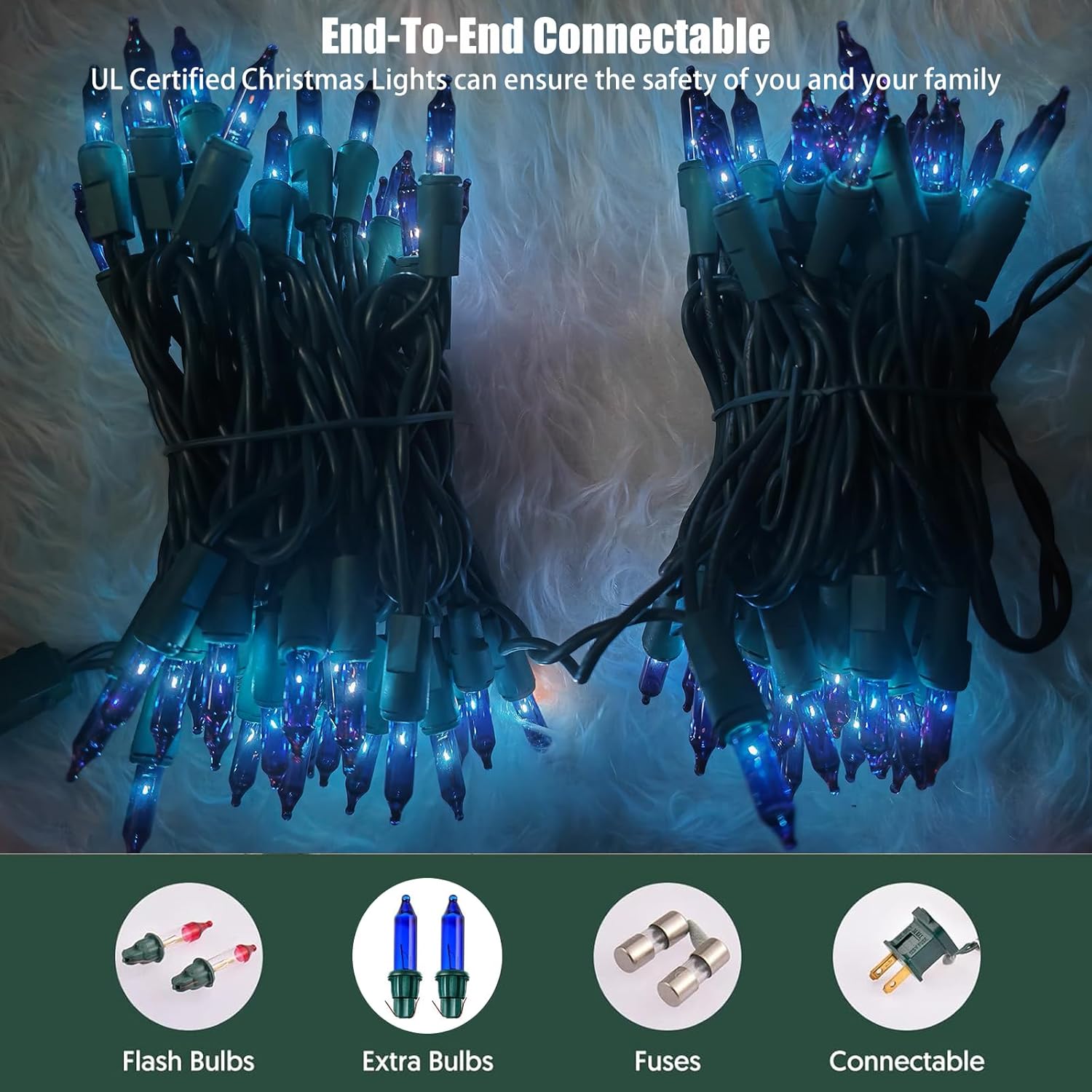 - Connectable Christmas Lights String: Each Christmas light has an end-to-end connector,can connect up to 5 of these string lights end to end for a total of 105 feet of lighted length.