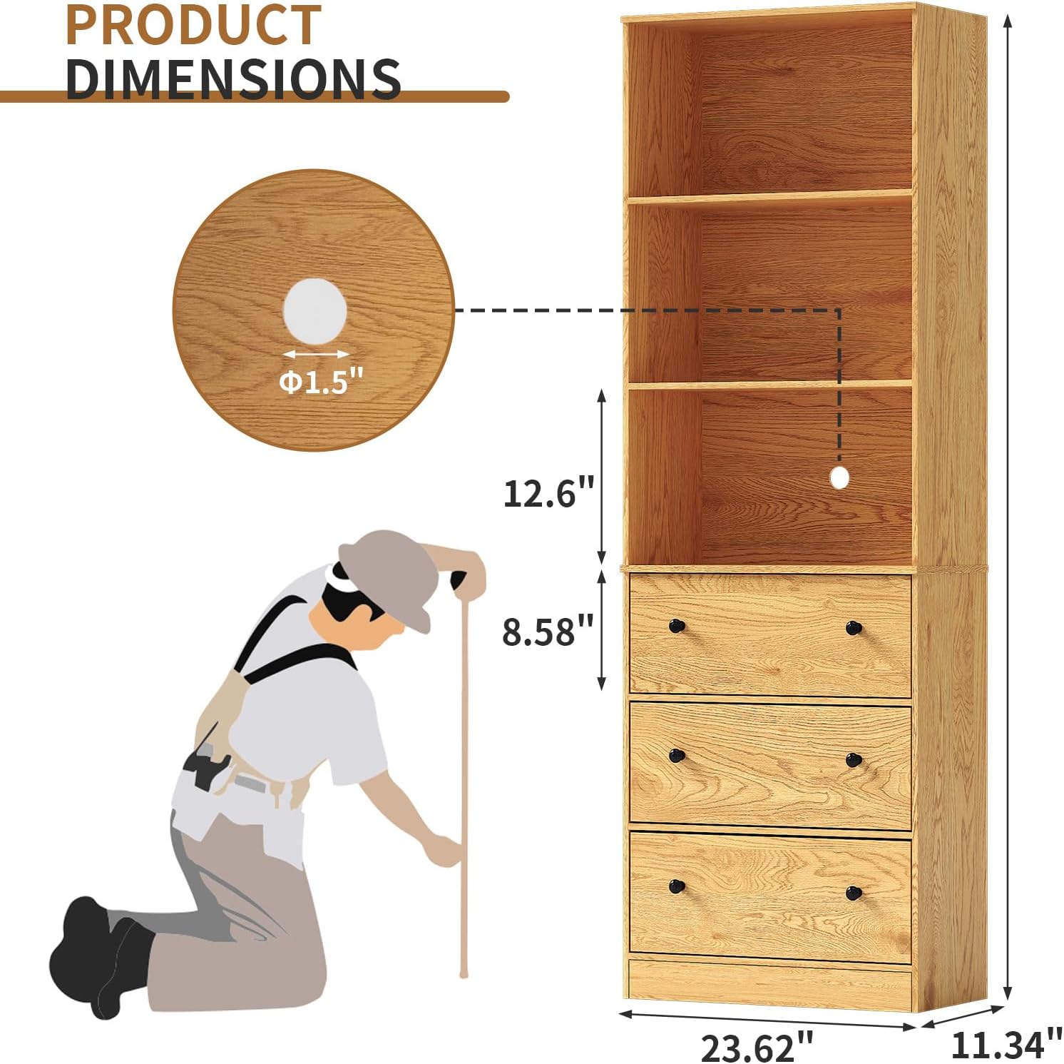 - ćEnough Storage Spaceć- The size of bookshelf is 23.62"Ć11.34"Ć70.87". The height of open shelves is 12.6", and the drawer is 8.58", they can meet the storage needs of daily life and is a good storage cabinet