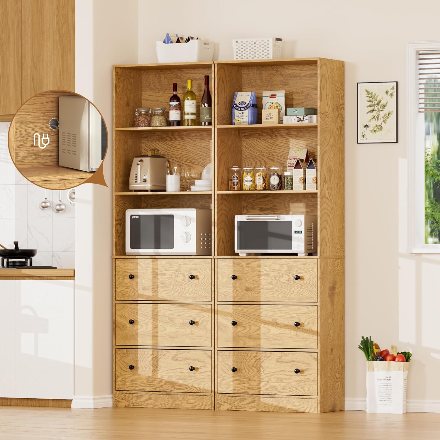 - ć71" Tall Bookcases Set of 2ć- Two large bookcases with 3-tire open shelves and 3 drawers is made of high-quality particleboard, waterproof and scratch-resistant. Equipped with anti-tipping iron plate, the natural bookcases are more stable to use