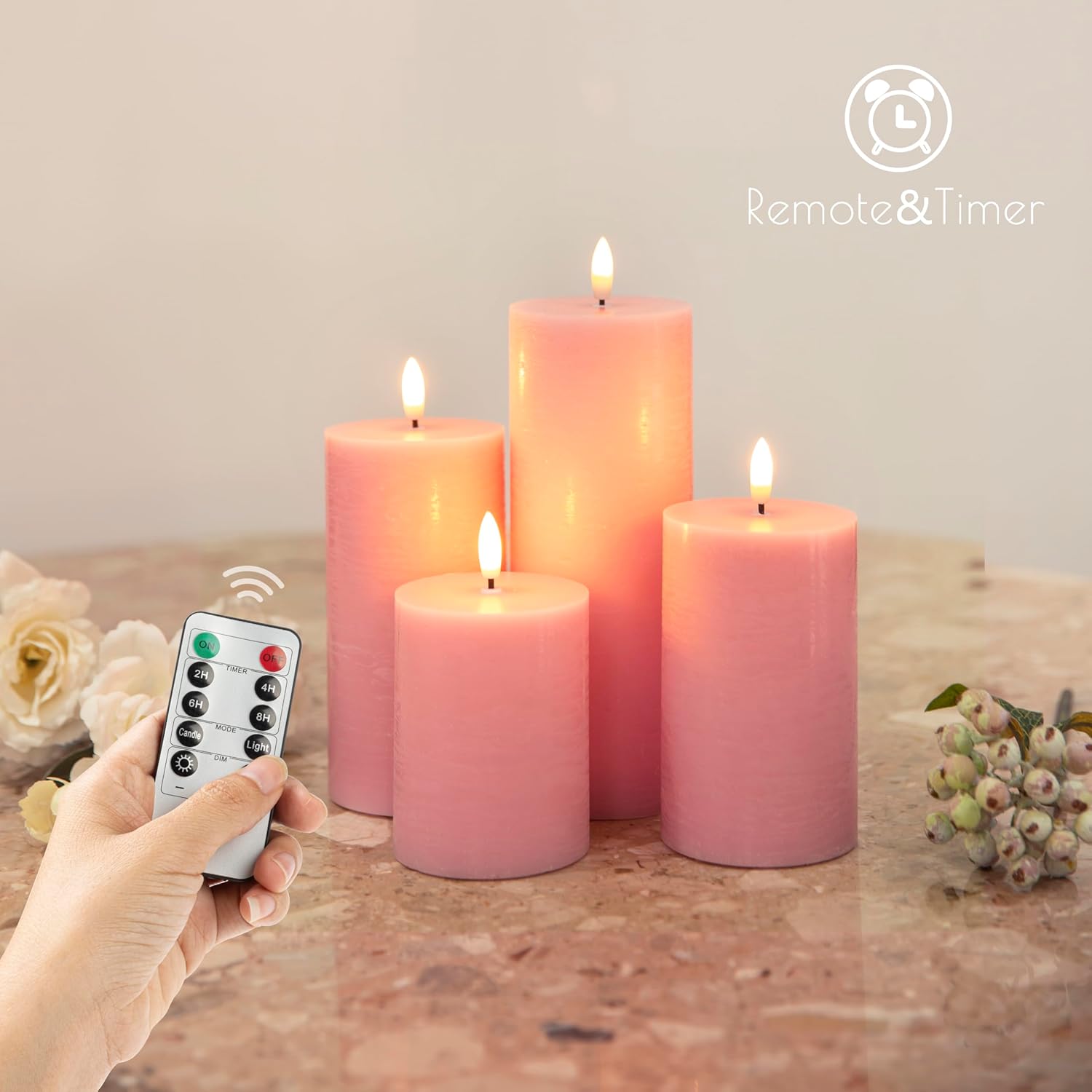 LUSHABOR Flameless Candles, 4 Pack Battery Operated Candles with Remote, Real Wax LED Fake Candles with Timer Flickering for Christmas Wedding Home Party D3 H 5" 6" 7" 9" Pink