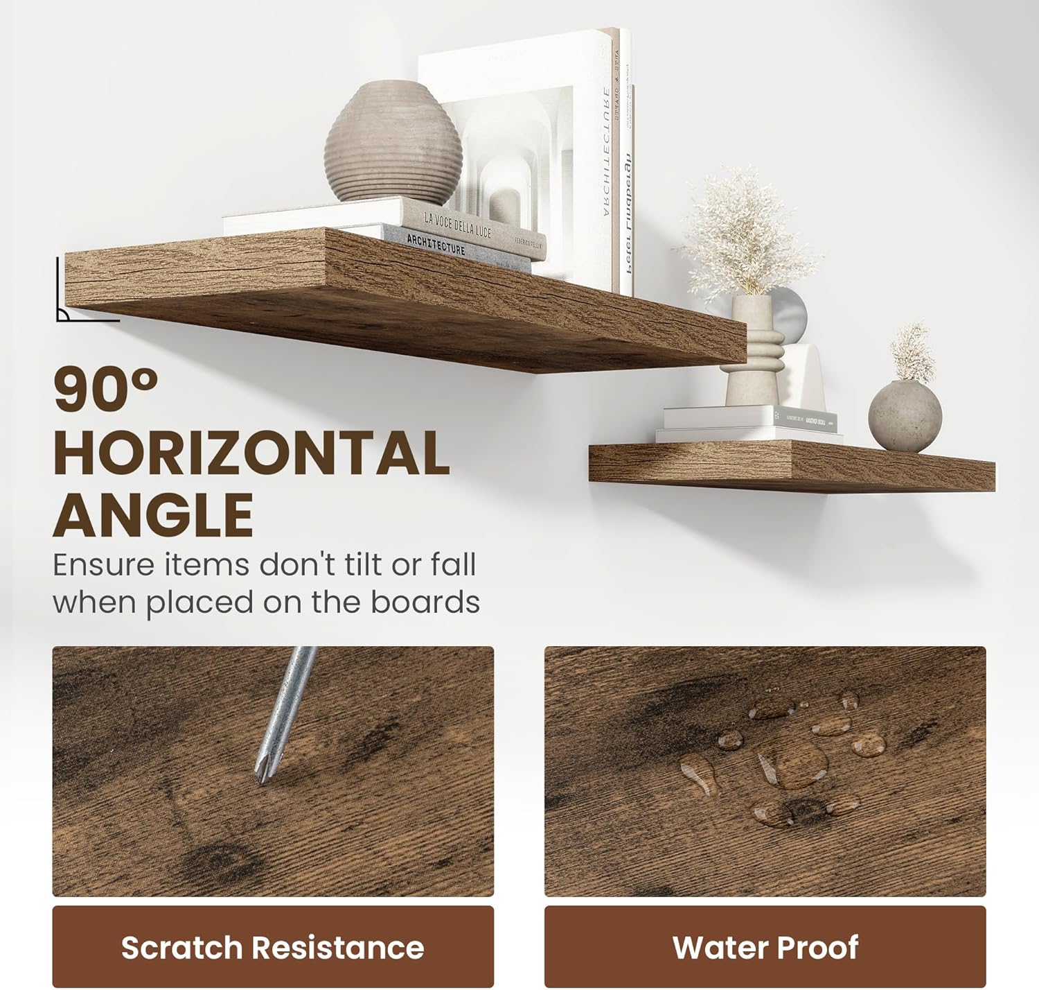 - ćPremium Quality ConstructionćCrafted from high-grade engineered wood with an invisible one-piece bracket, these floating shelves offer a robust and sleek design. The rustic wooden grain finish not only adds a touch of elegance but also infuses warmth into any room, making them a perfect fit for both modern and traditional interiors.