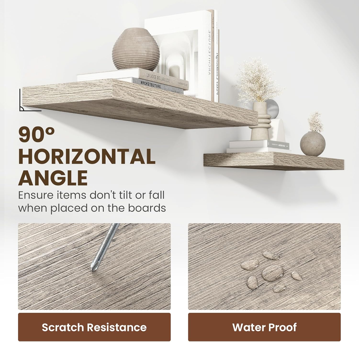 - ćPremium Quality ConstructionćCrafted from high-grade engineered wood with an invisible one-piece bracket, these floating shelves offer a robust and sleek design. The rustic wooden grain finish not only adds a touch of elegance but also infuses warmth into any room, making them a perfect fit for both modern and traditional interiors.