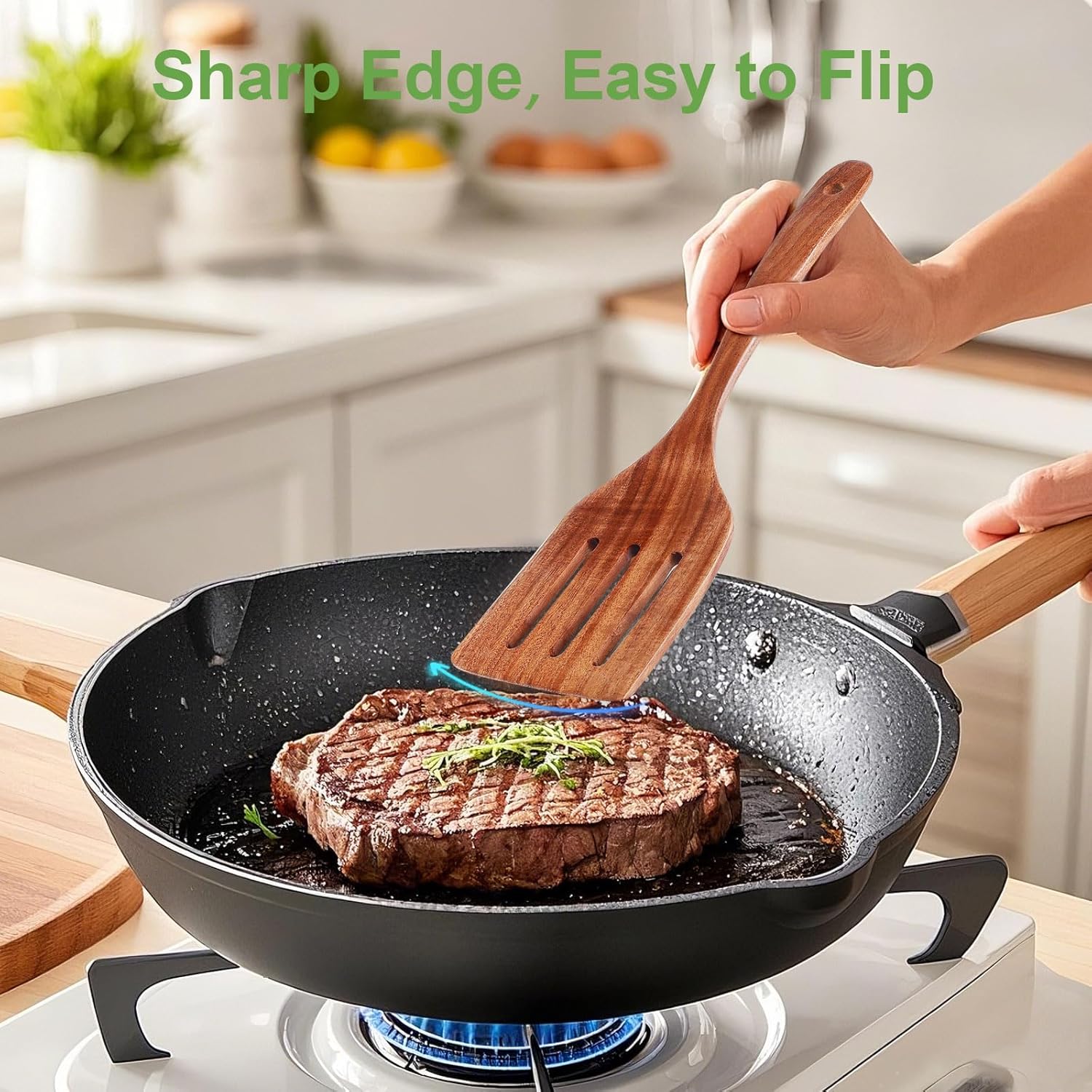- PREMIUM QUALITY: Spatula in this cooking utensil set are crafted from sturdy, naturally sourced acacia wood. The Wooden Kitchen Utensils Set includes a solid spatula and a slotted turner. These wooden utensils feature an elegant grip design and come in practical, ergonomic sizes to meet all your cooking needs.