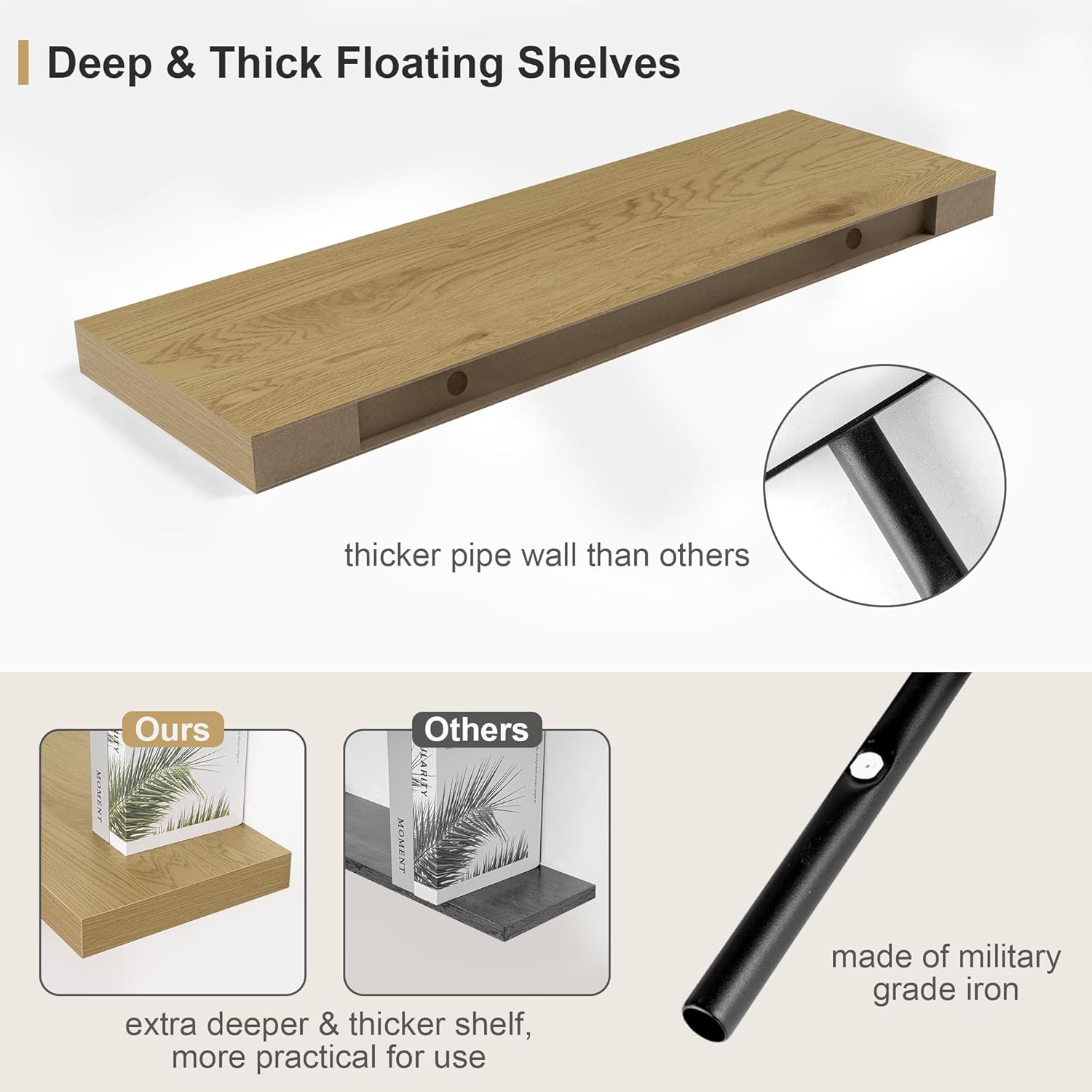 12" Deep Oak Floating Shelves,Over Toilet Long Wall Mounted Modern Farmhouse 36 inches,Wall Shelves with Invisible Brackets for Bedroom, Bathroom, Living Room, Kitchen, Set of 1