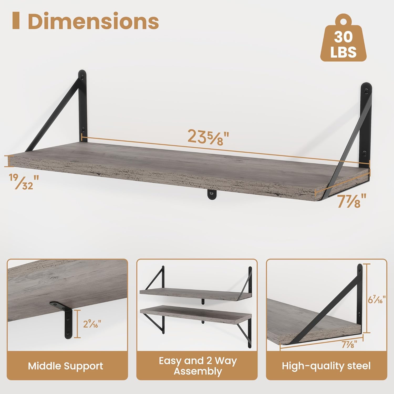 Heimlove Floating Shelves for Wall 24 Inches,8 Inches Deep Wall Bookshelf Mounted Display&Storage Wood Shelves for Kitchen Bathroom Laundry Living Room,Set of 3 (Silver Grey)